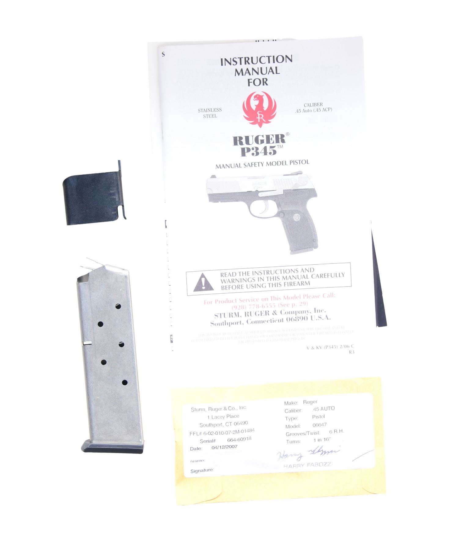 2) P345 WITH MATCHING BOX. Cal. 45 ACP. S# 664-60918. Mfg. 2007 as Model 06647 / Catalog No. P345PR. Blued finish with black polymer frame. Bbl. 4.5". MAGS: 2-8 Rds. UNATTACHED ACCESSORIES: factory box & packaging. CONDITION: near excellent overall. Bore is bright with strong rifling. (24-3457/MD). ALL MODERN. $600-950.
