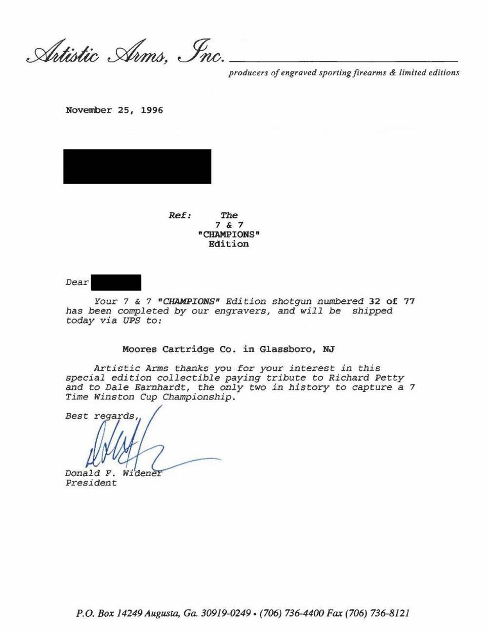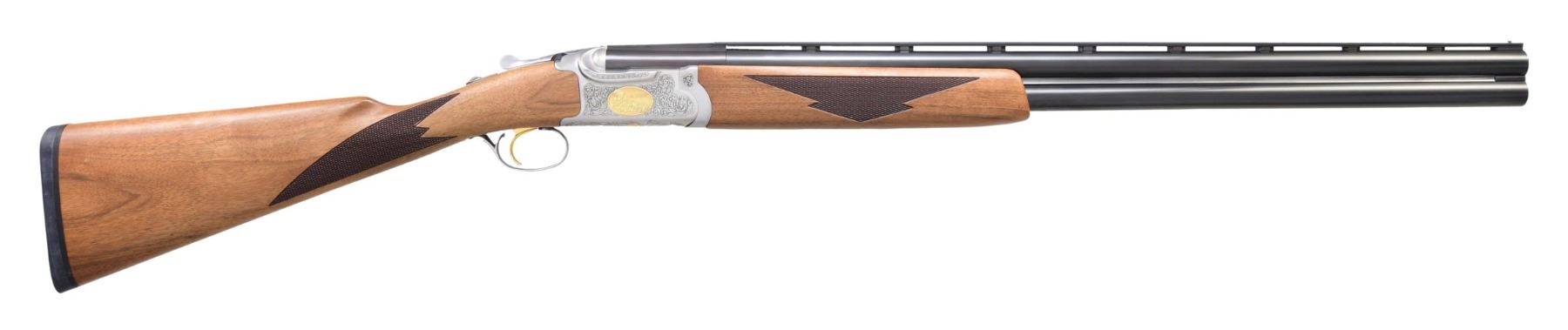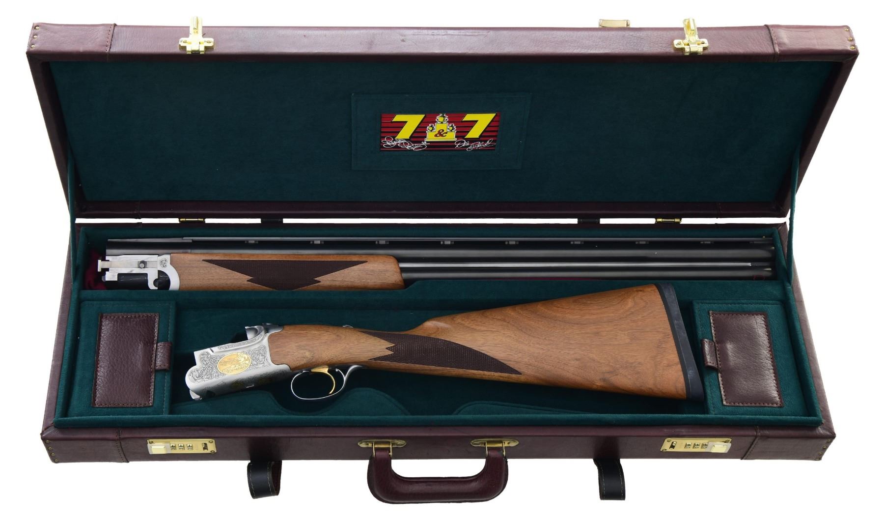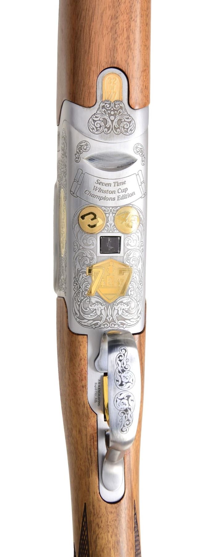 O/U SHOTGUN. Cal. 12 ga. 3". S# 411-10574. Bbls. 28" vent rib w/ interchangeable chokes. Full set of five tubes included. Stainless steel boxlock action w/ special ornamentation commemorating Dale Earnhardt & Richard Petty's seven time Winston Cup wins. Sides of receiver have gold plated ovals depicting the winners & their cars. Bottom of receiver has gold plated emblems w/ car numbers & shield w/ 2 number 7s. Balance of action has generous coverage of vine type foliate scroll ornamentation w/ years of the wins listed on the upper receiver rails. Ornamentation is signed by A & A Engraving, Rapid City, SD. Forearm & straight grip stock of English walnut w/ cut checkering & solid black Ruger pad. Gold plated SST. Selective ejectors. UNATTACHED ACCESSORIES: naugahyde covered luggage case w/ green velour fitted interior & cloth gun cover. CONDITION: near excellent, appears unused. (23-6505/DS). MODERN. $1,200-1,800.