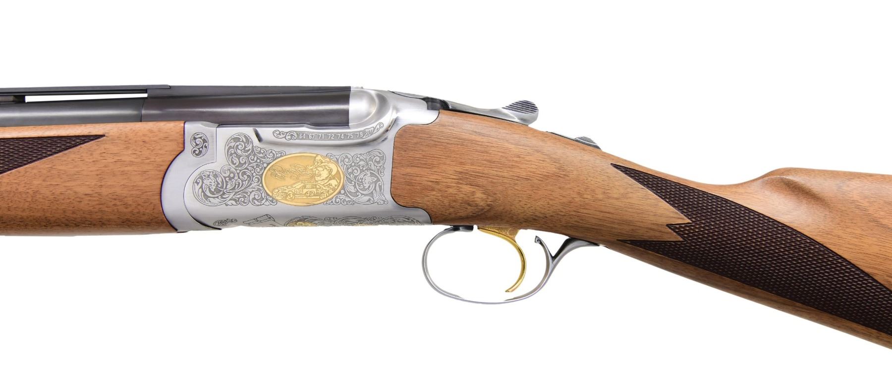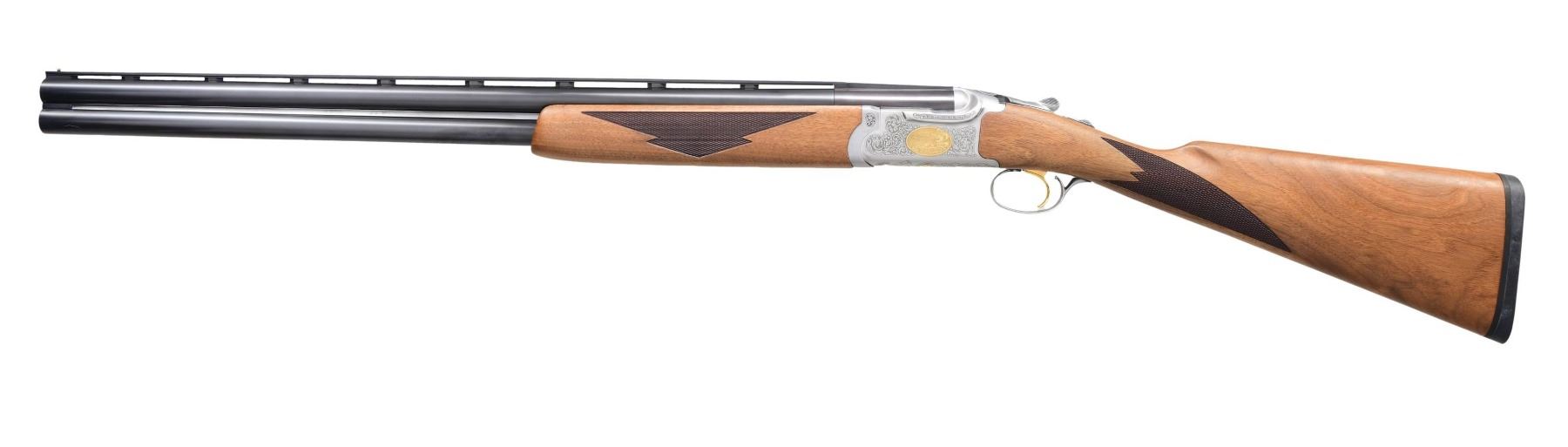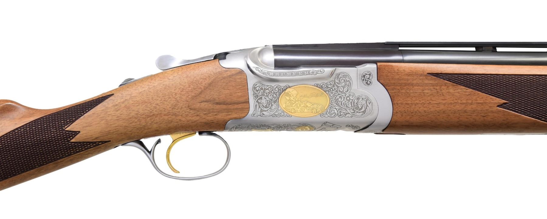 O/U SHOTGUN. Cal. 12 ga. 3". S# 411-10574. Bbls. 28" vent rib w/ interchangeable chokes. Full set of five tubes included. Stainless steel boxlock action w/ special ornamentation commemorating Dale Earnhardt & Richard Petty's seven time Winston Cup wins. Sides of receiver have gold plated ovals depicting the winners & their cars. Bottom of receiver has gold plated emblems w/ car numbers & shield w/ 2 number 7s. Balance of action has generous coverage of vine type foliate scroll ornamentation w/ years of the wins listed on the upper receiver rails. Ornamentation is signed by A & A Engraving, Rapid City, SD. Forearm & straight grip stock of English walnut w/ cut checkering & solid black Ruger pad. Gold plated SST. Selective ejectors. UNATTACHED ACCESSORIES: naugahyde covered luggage case w/ green velour fitted interior & cloth gun cover. CONDITION: near excellent, appears unused. (23-6505/DS). MODERN. $1,200-1,800.