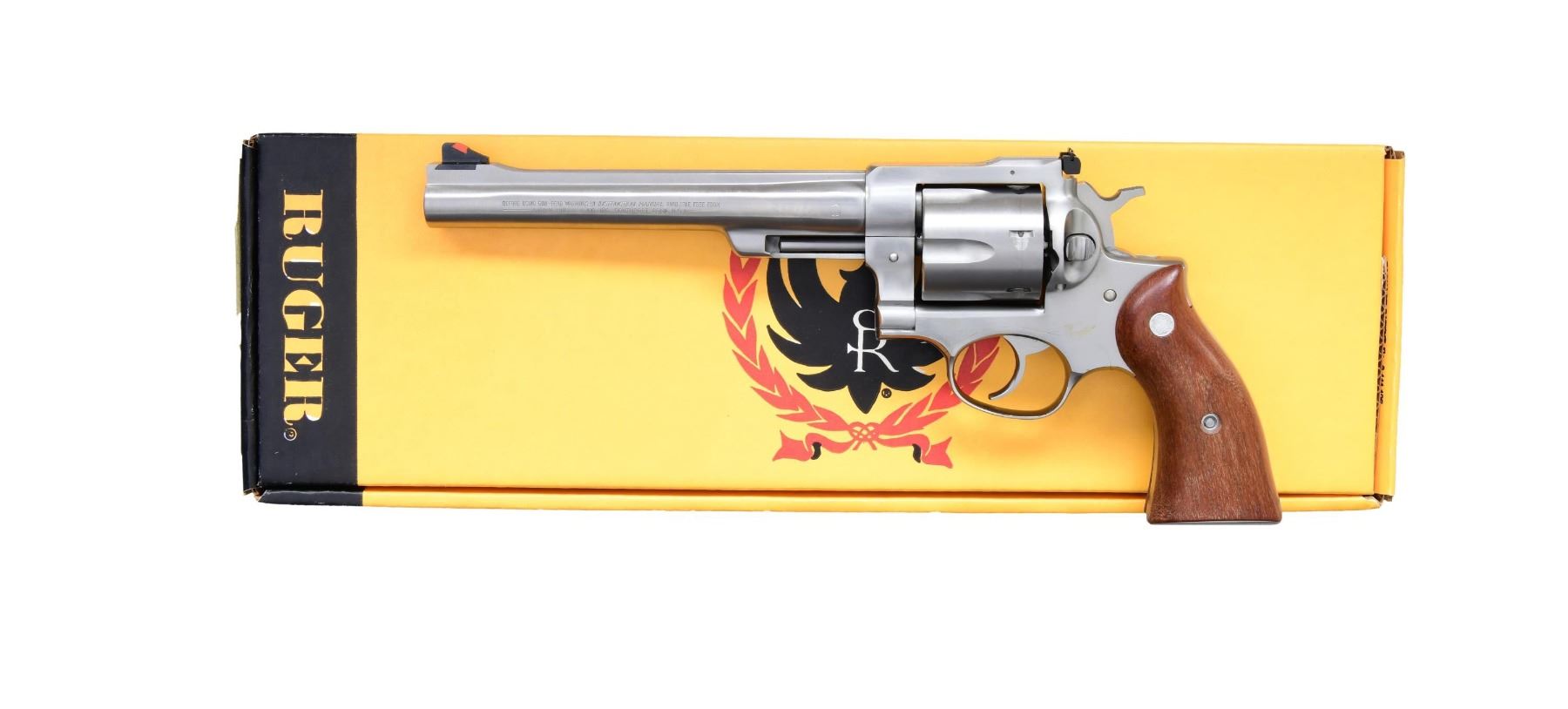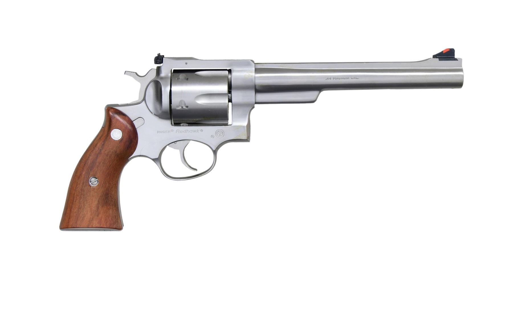 RUGER REDHAWK MODEL 05001 DA REVOLVER WITH MATCHING FACTORY BOX & SHIPPING SLEEVE. CAL. 44 MAG. S# 500-08917 (1981). Catalog No. KRH-44. This Ruger Redhawk features a stainless steel finish. The barrel length is 7.5 inches. It is equipped with a ramp front sight with a red insert and an adjustable rear sight. The revolver has a double action trigger with a stainless steel hammer. The frame is a standard configuration. The cylinder holds six rounds and is fluted. The grips are smooth wood with Ruger medallions. UNATTACHED ACCESSORIES: Factory box, shipping sleeve and paperwork. CONDITION: Overall condition is near excellent with 95% of the original finish remaining on the barrel and frame. The grips are in excellent condition. The bore is bright with strong rifling. MODERN (24-2910/MD) $600-$900.