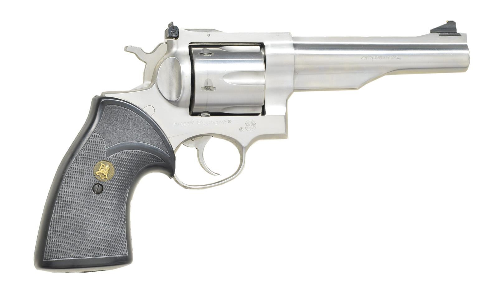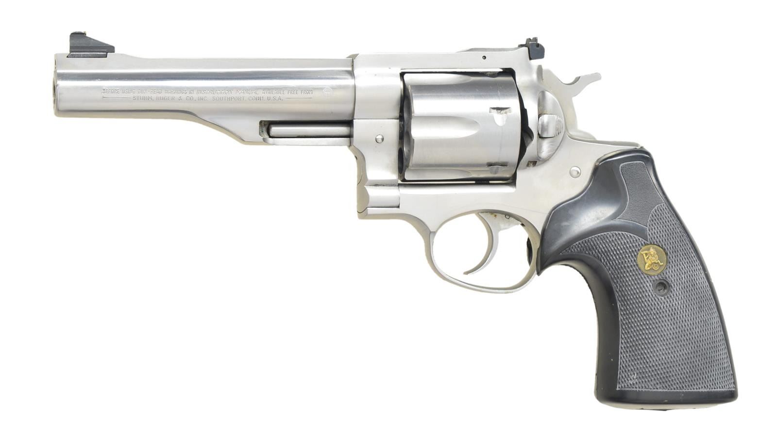 Cal. 44 Mag. S# 501-33510. Bbl. 5 1/2". Ramped gold bead front sight. Adj. rear sight. Stainless finish. Pachmayr Presentation grips. CONDITION: grips show scattered dirt staining & handling marks. The metal shows a few small specks of light oxidation & some handling wear. Very good bore. (22-4371/MJC). MODERN. $400-600.