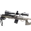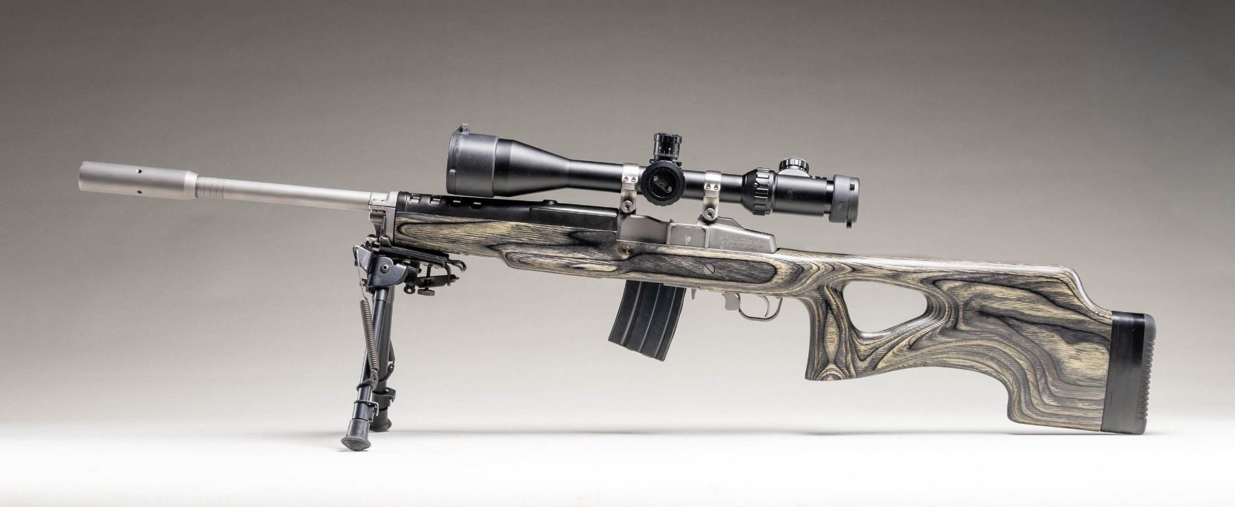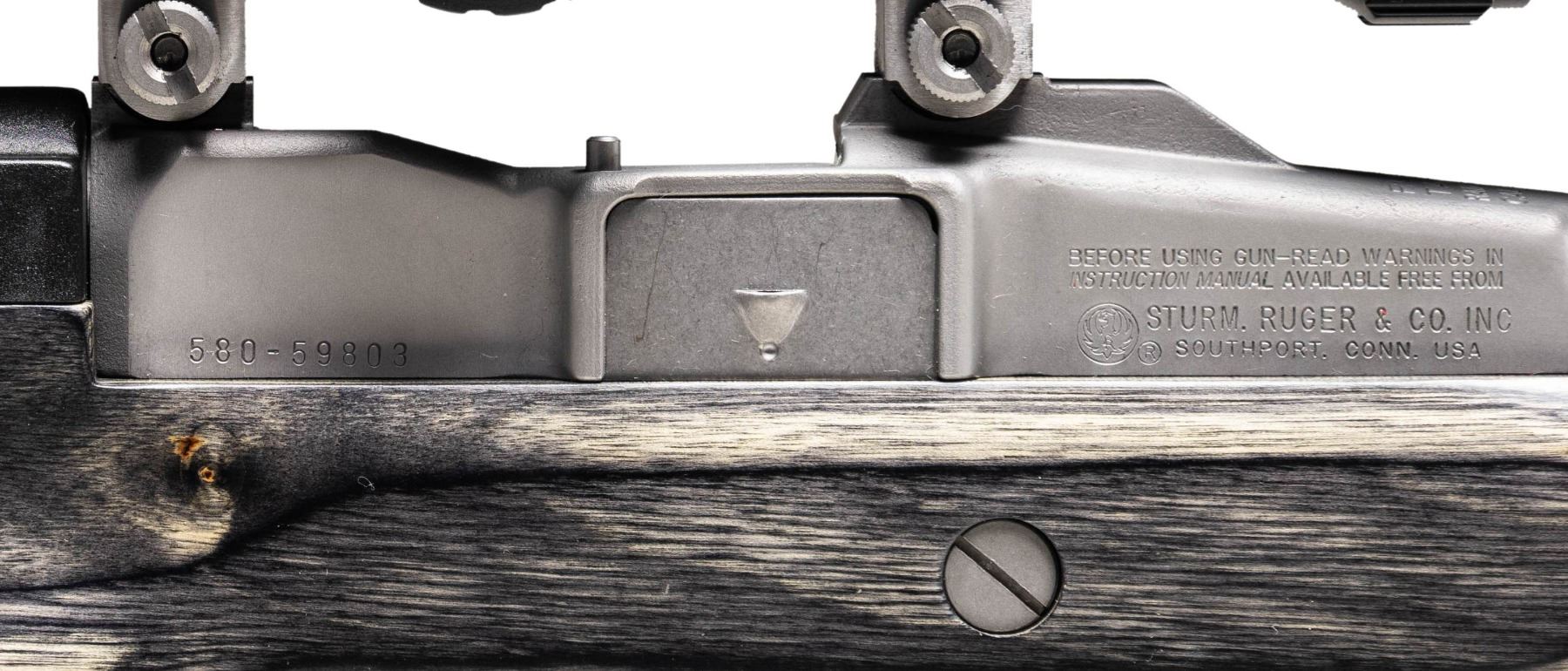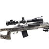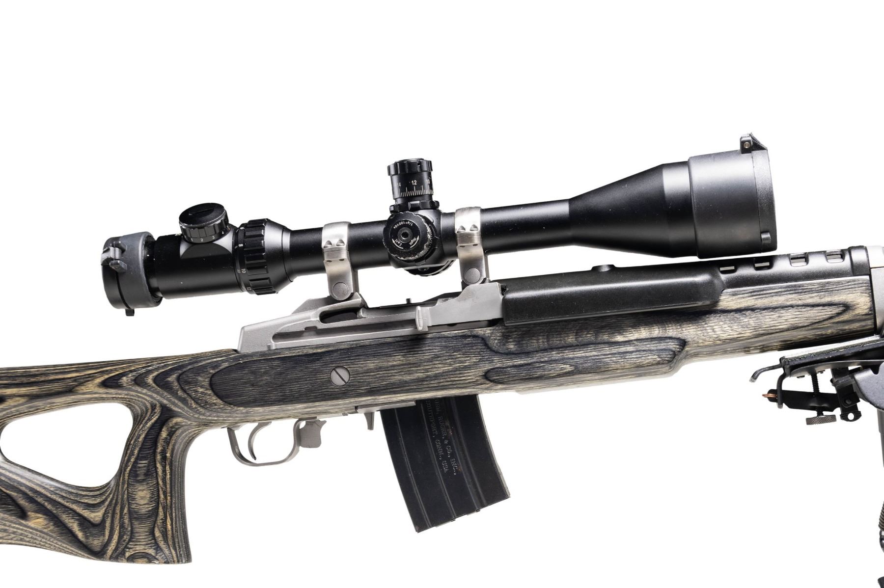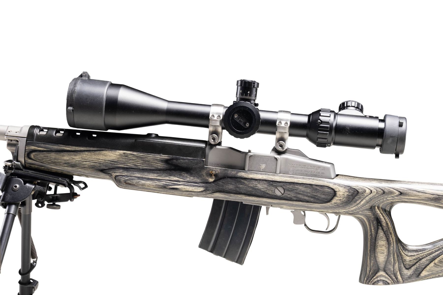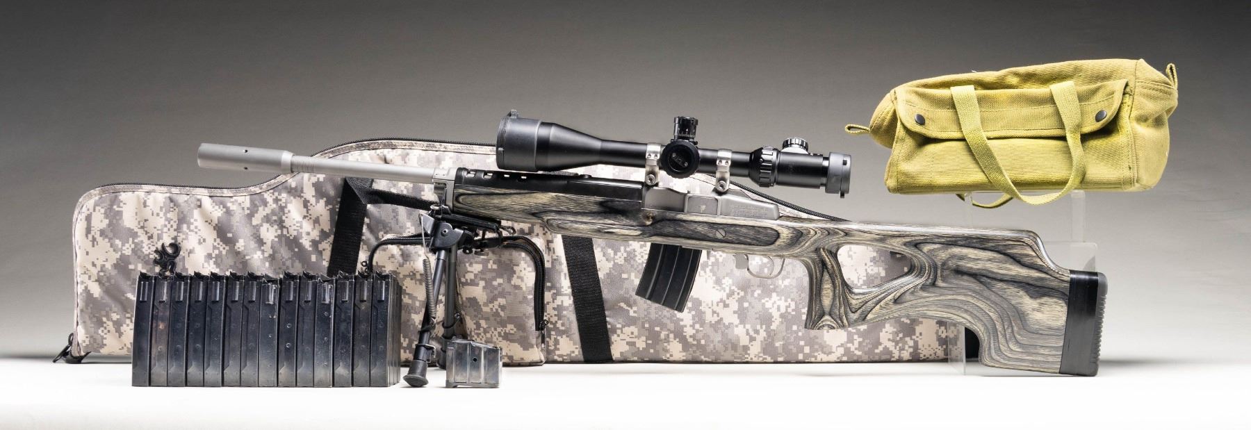 RIFLE & ACCESSORIES. Cal. .223 Rem. S# 580-59803. Bbl. 22 heavy with target crown, harmonic dampener plus 1 in 9" RH twist; no provision for sights. Mfg. 2008 (1982 to date for all Ranch Rifles) as stainless Model 05808 Ranch Rifle with black laminated thumbhole stock having factory spacers allowing for 14.12" to 15.62" (current) LOP. Factory ventilated black fiberglass handguard. Standard 2 stage trigger. Originally designated K-Mini-14/5T as Target Model with 5 rd. magazine. Ranch Rifle configuration with receiver factory milled for its 30MM Ruger scope rings holding matte black Millett TRS-1 4-16X50 scope having side focus, target knobs, operable green illuminated mil dot reticle plus "NV" setting for night vision use; includes flip up factory caps (missing name tag on focus wheel). Harris bipod adapter and SLM pivoting bipod. MAGS: 16 TOTAL: 15 are blued 20 round mags; 13 near excellent factory (2 with light oxidation and 1 of those with law enforcement ban marking) plus 2 very good aftermarket mags. 1 factory 5 rd. with light oxidation. UNATTACHED ACCESSORIES: near excellent military appearing zipper closing canvas carry bag. Camo design on zippered nylon case having 2 zippered compartments and black Browning logo. CONDITION: all aspects of entire package are near excellent except magazines as noted. (25-6203/NW). MODERN. $850-1,200.