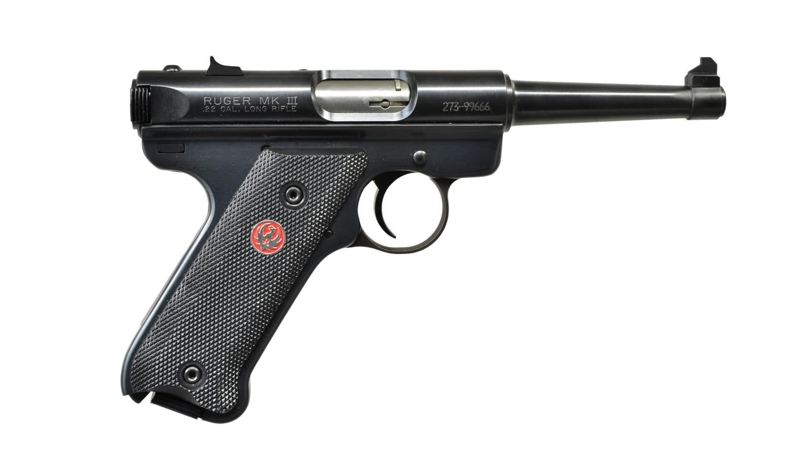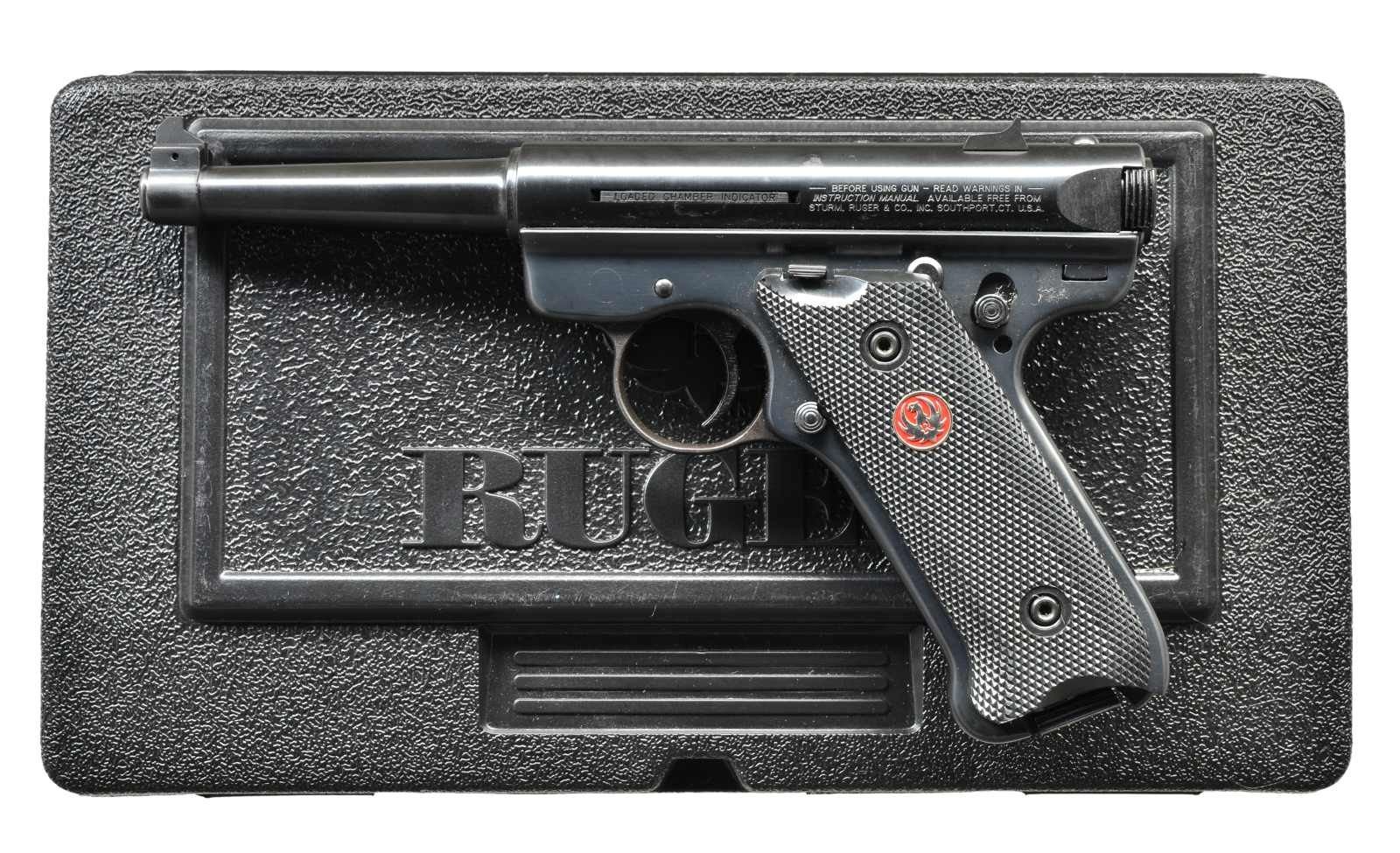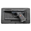 Cal. 22 LR. Bbl. 4 3/4" S# 273-99666. Mfg. 2013 w/ all blued finish including bolt & trigger. Latest features to include push button mag. release, loaded chamber indicator plus receiver drilled & tapped for scope mt. Blade front sights & drift adj. rears. Blued finishe w/ checkered black plastic grips having red eagle medallions. Updated features of last rd. hold open & allowing bolt operation w/ safety engaged. MAGS: 2-10 rd. UNATTACHED ACCESSORIES: factory plastic case w/ black packaging. CONDITION: all aspects near excellent; appearing unfired. (21-4402/NW). MODERN. $300-450.