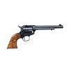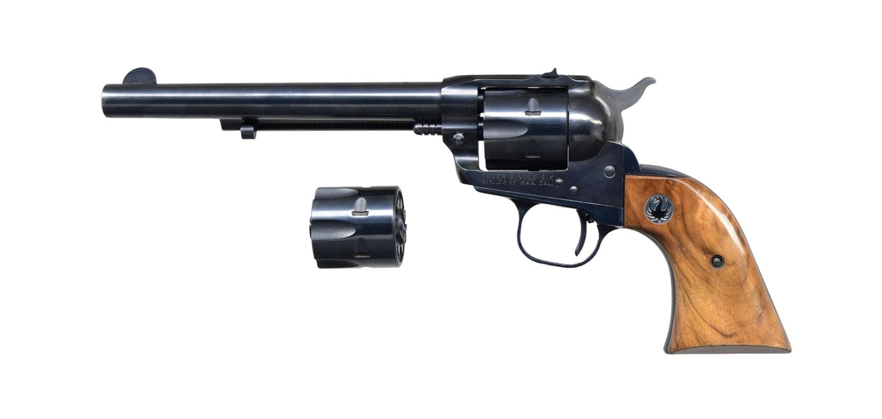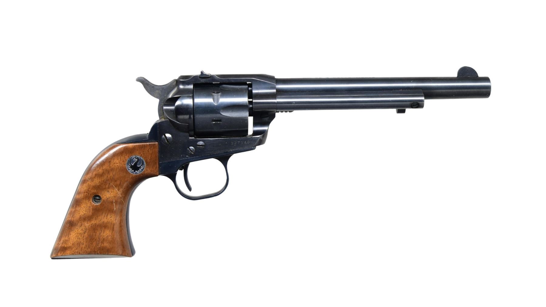 Cal. .22 LR / .22 Mag. S# 327340. Manufactured by Sturm, Ruger & Co. from 1953 to present, with production of this variant ceasing in 1973. Features a blued finish. Barrel length is 6.5 inches. The front sight is a ramped blade and the rear sight is an fixed notch. It has a standard trigger and a spurred hammer. The frame is a standard configuration. The cylinder is fluted and holds six rounds, with an additional matching numbered interchangeable cylinder for .22 Magnum. The grips are smooth walnut with Ruger medallions. UNATTACHED ACCESSORIES: Includes an additional .22 Magnum cylinder. CONDITION: Overall condition is very good with approximately 97% of the original blued finish remaining on the barrel and frame. The grips show minor handling marks. The bore is bright with strong rifling. CURIO (23-6714) $300-500.