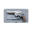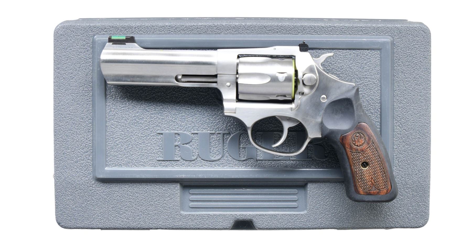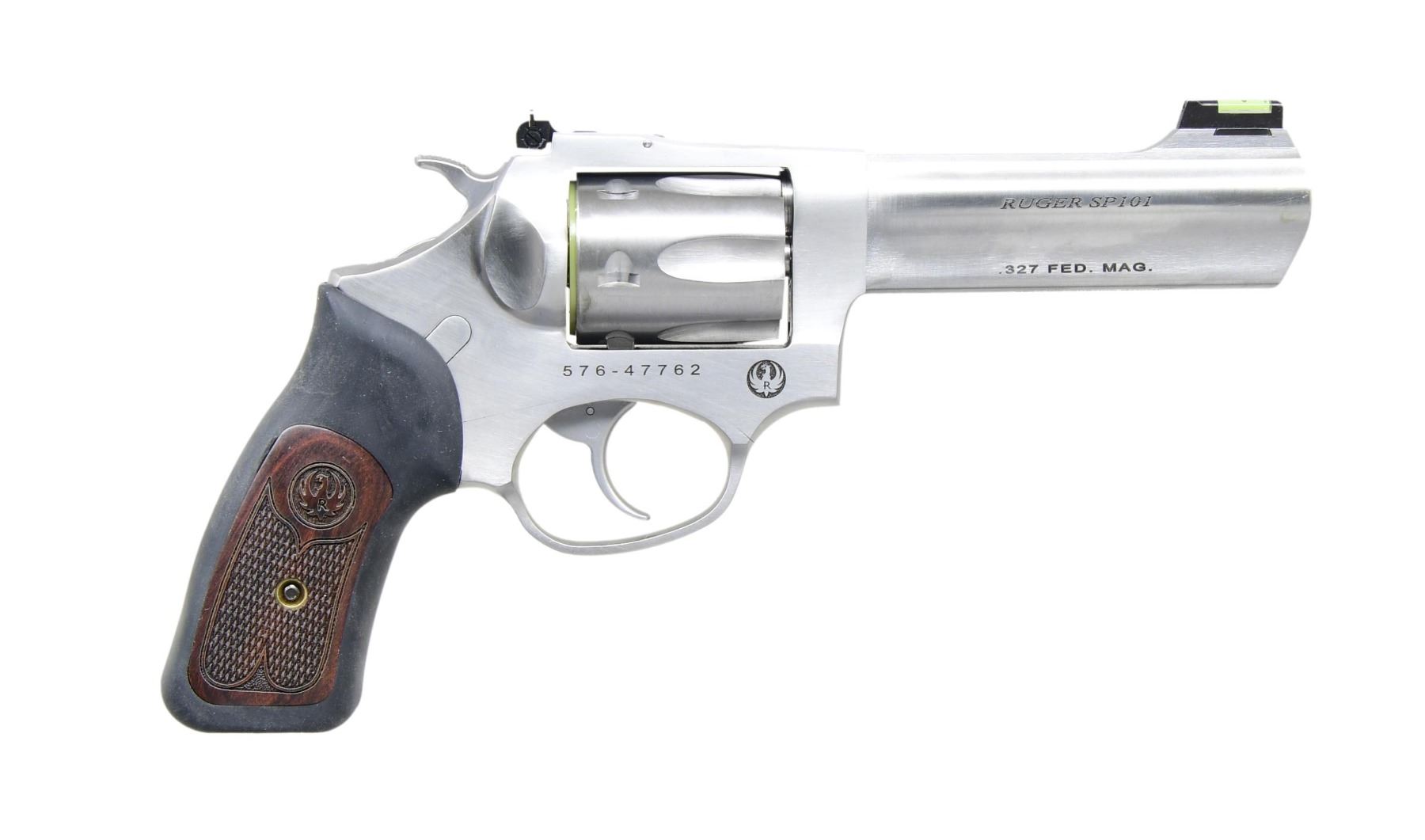 Cal. .327 Fed. Mag. S# 576-47762. This model features a stainless finish, production started in 1989. It has a 4.2-inch barrel with a green fiber optic front sight and an adjustable rear sight. The revolver is equipped with a standard trigger and hammer. The cylinder holds six rounds and is fluted. The grips are checkered wood with a Ruger medallion and black rubber overlays. CONDITION: Overall excellent with 99% original stainless finish on the barrel and frame. Grips are excellent with sharp checkering. Bore is bright and clean. MODERN (23-6117) $400-600.