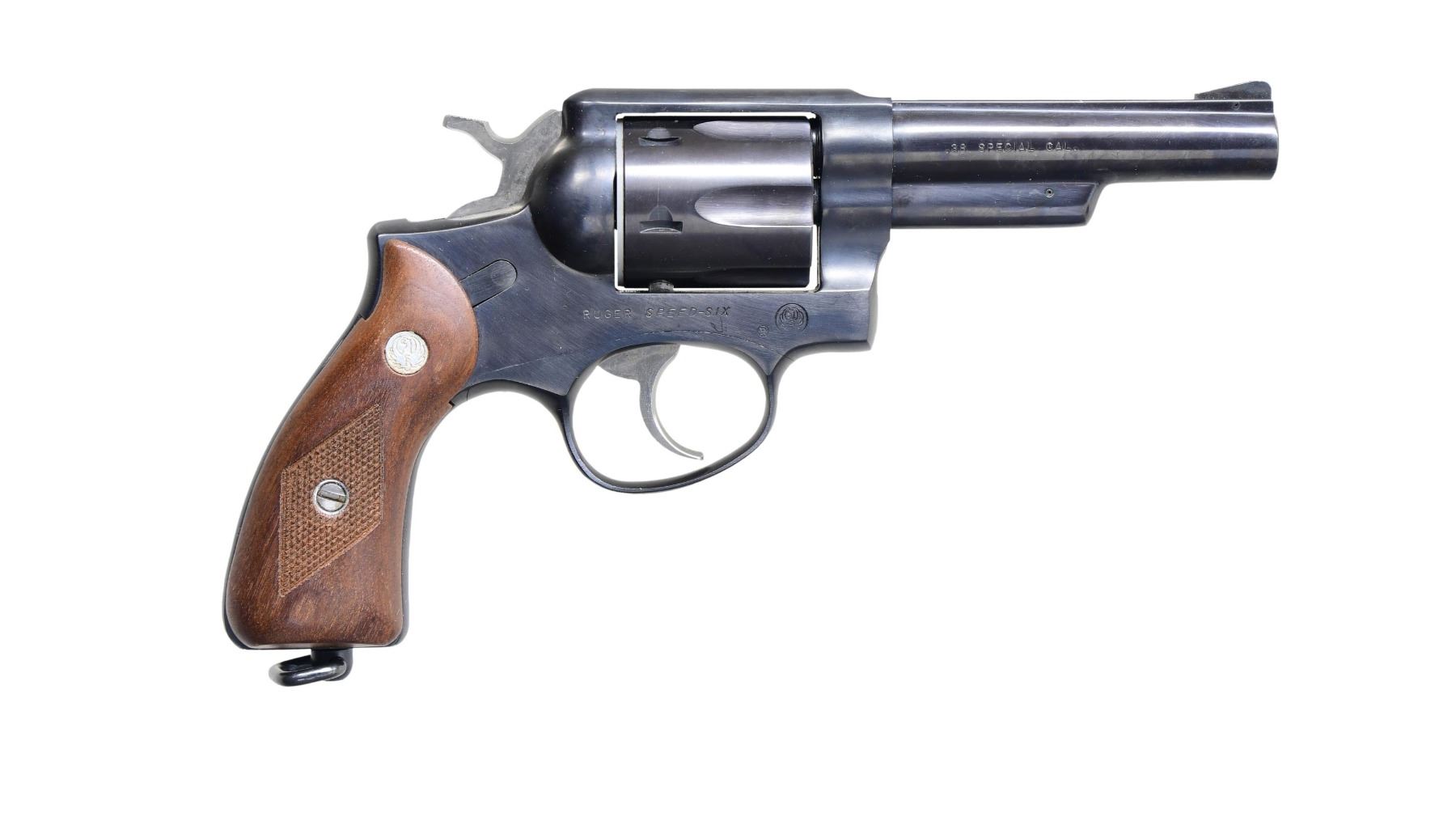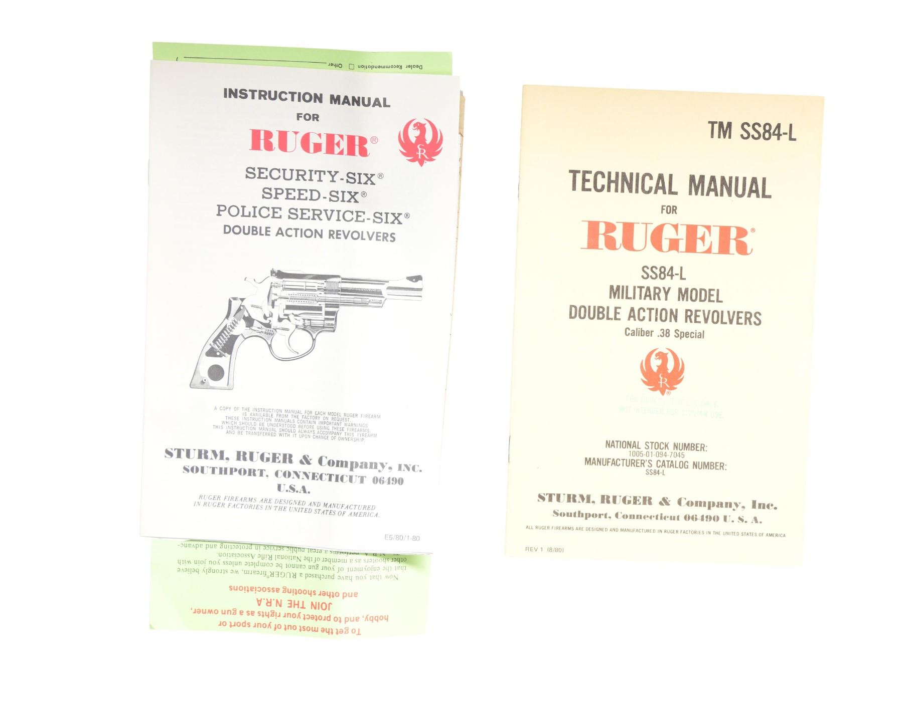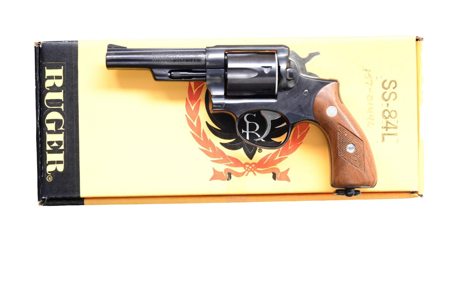 RUGER BOXES. Cal. .38 Spl. S# 157-01446 Mfg. 1981 as Catalog# SS84-L; overrun from a government contract. Blued finish. Bbl. 4". Fixed front sight, fixed rear sight. Cylinder holds 6 rounds, fluted. Checkered walnut grips with Ruger medallions. Butt has lanyard loop. UNATTACHED ACCESSORIES: factory box, instruction manual, technical manual. Outer box with label information, packaging for sealed military contact & final shipping box. CONDITION: overall condition is near excellent with over 95% of the original finish remaining. Grips are in near excellent condition with minimal wear. Bore is bright and sharp. (24-2905/MD). MODERN. $500-$800.