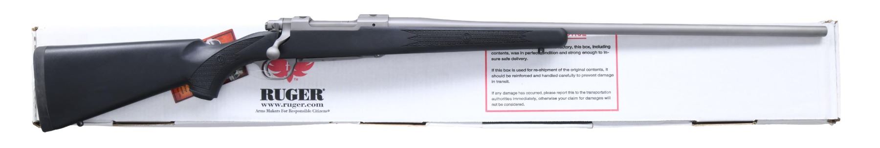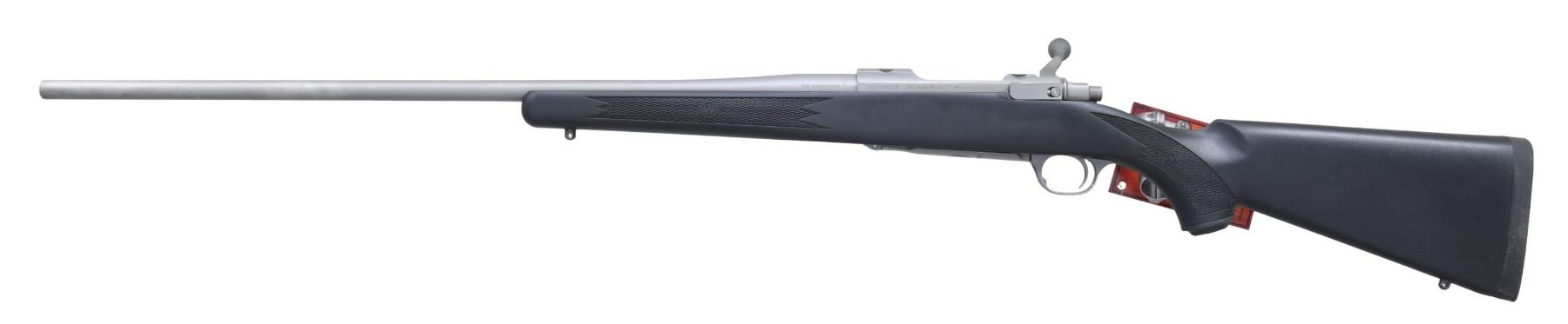Cal. 6.5 Creedmoor. S# 711-29729. Bbl. 26" without provision for sights. Mfg. 2011 (2007-2014) as HKM77RFP (Model number 37105) having checkered black synthetic stock with black rubber pad, grip cap and sling studs. Matte stainless finish to include triggerguard / floorplate assembly engraved with Ruger eagle and "RUGER". UNATTACHED ACCESSORIES: matching numbered factory box with packaging to include scope rings. CONDITION: all aspects near excellent with new, unfired appearance. (24-3725/NW). MODERN. $400-550.