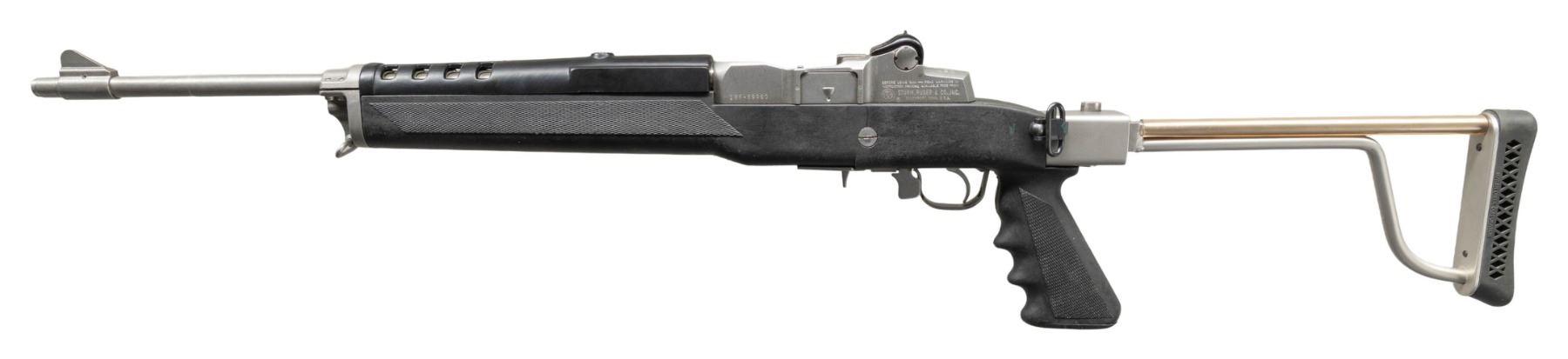 BUTLER CREEK FOLDING STOCK. Cal. 223 Rem. S# 185-69960. Bbl. 18 1/2" with banded serrated blade front sight and factory receiver sight at rear. Mfg. 1989 as Model 01805 with hardwood carbine stock that has been replaced with a Butler Creek folding stock; standard black Ruger fiberglass handguard. MAGS: 1 factory 5 rd. CONDITION: all aspects near excellent including bore. (25-6041/NW). MODERN. $750-1,000.