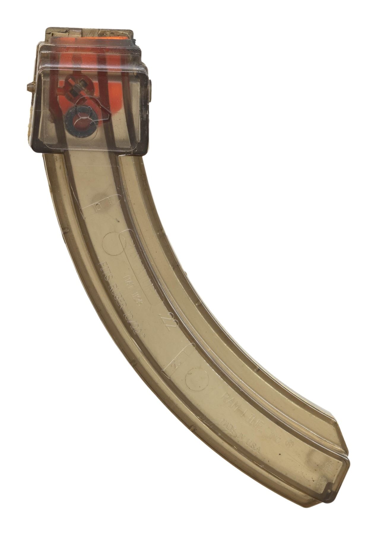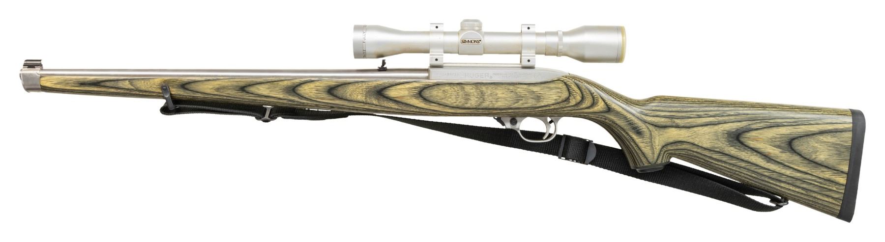 CARBINE. Cal. 22 LR. S# 241-94215. Bbl. 18 1/2" with banded blued brass bead front sight and folding leaf rear. Shipped 1995 (1964 to date for all 10/22's) as Stainless Model 01132 (K10/22RBIBBZ) having smooth black laminated Mannlicher style stock with black Ruger logo rubber pad, sling swivels and black nylon sling with "RUGER" marking in red. Ruger adapter scope base installed along with natural aluminum 1" scope rings holding Simmons 4X32 brushed aluminum .22 scope having duplex reticle. MAGS: 2 TOTAL: 1 factory 10 round and 1 RamLine Truncator 25 rd. CONDITION: all aspects near excellent including bore and scope set. (25-4832/NW). MODERN. $300-450