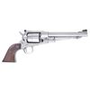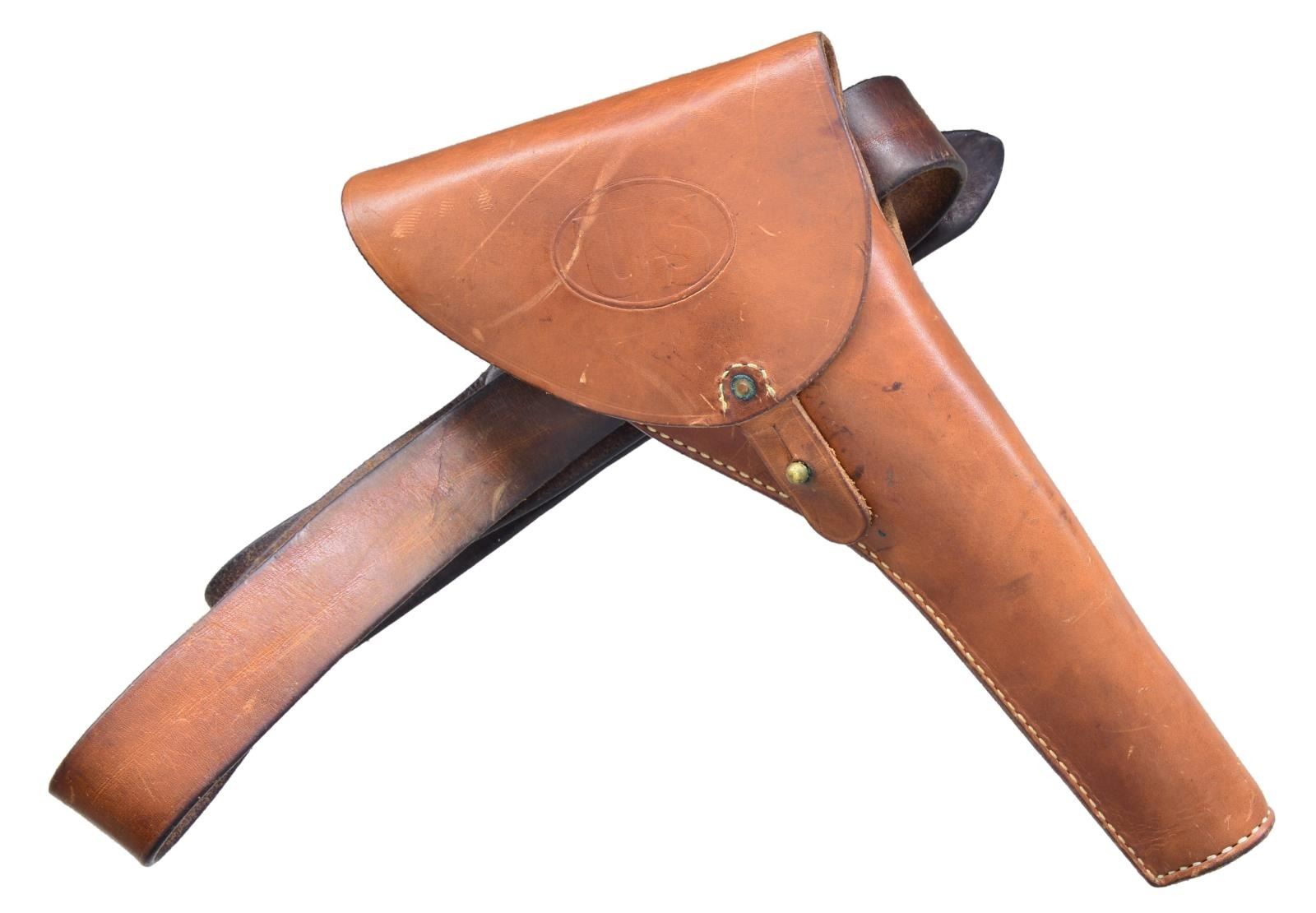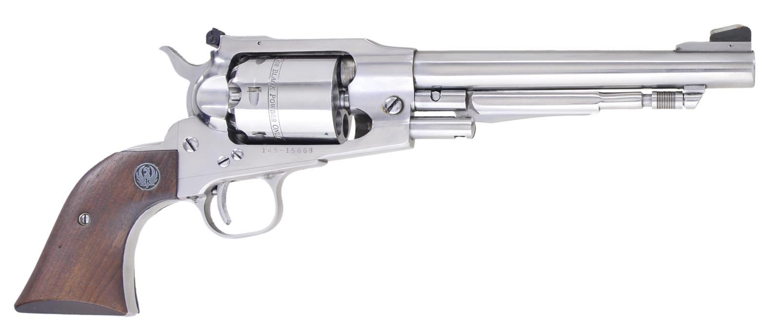 Cal. S# 145-15668. Bbl. Mfg.1978 (1975-1981 for this model; 1972-2009 for all variations) w/ blued blade front sight plus blued frame mounted adj. rear; "warning" marks on bbl. Desirable stainless model w/ wood grips having silver eagle medallions. Wide grooved Super Blackhawk style trigger. UNATTACHED ACCESSORIES: lined El Paso Saddlery US marked brown leather flap holster w/ same brand belt of 54" length. Some sm. scuffs on holster & notable belt use. CONDITION: very good plus appearance w/ some extra polish appearance likely from cleanings. Front sight blade w/ smooth altered top shape; replaceable pin retained piece. Dark grips consistent w/ black powder use. Near excellent bore, nipples & chambers. (01-21183/NW). ANTIQUE. $600-900.