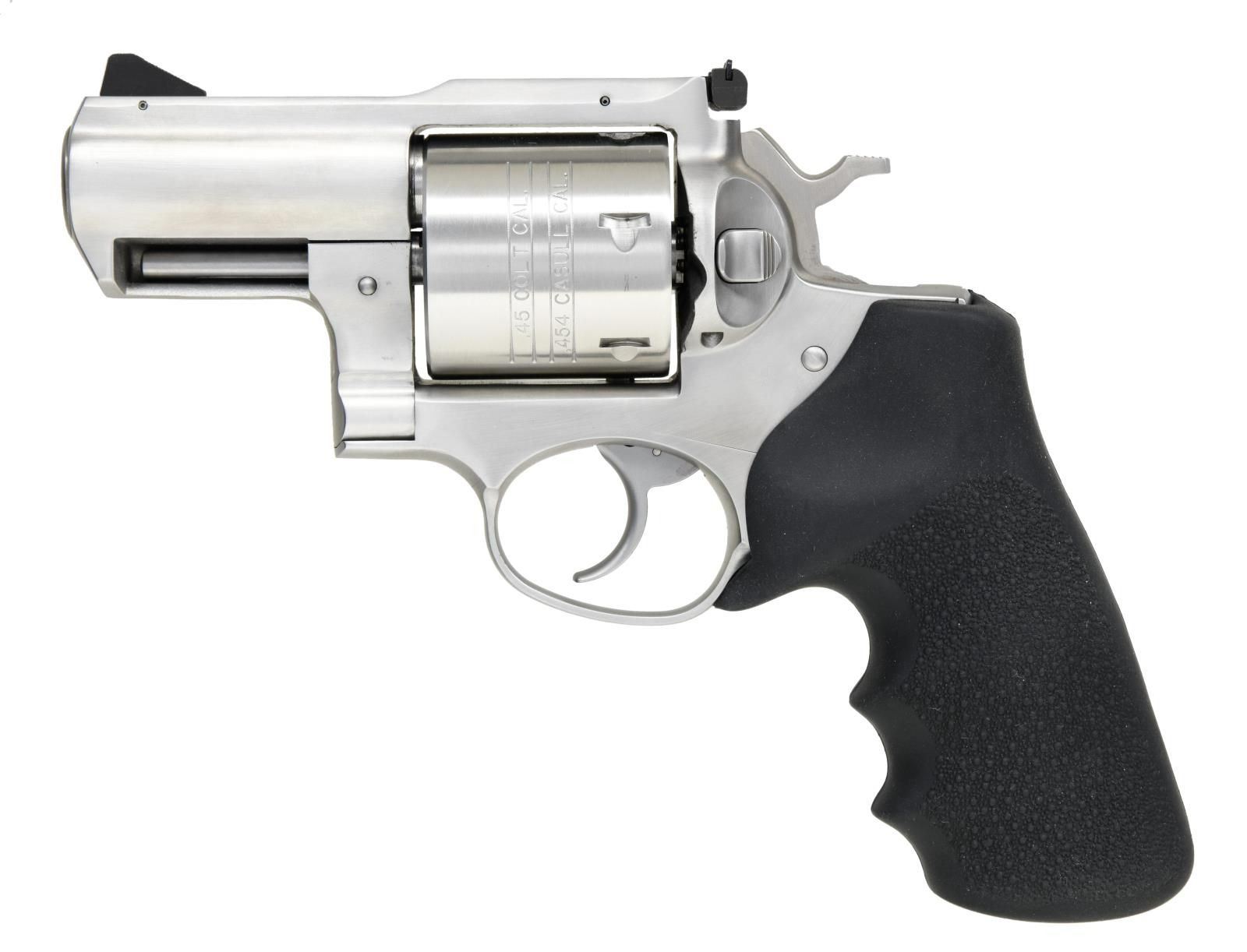 Cal. 454 Casull / 45 Colt. S# 530-66739. Bbl. 2.5" ribbed having serrated faced pinned blade front sight; frame mounted adjustable rear with white outline blade. Mfg. 2022 with model number 05301 and catalogue number KSRH-2454; stainless. Powerful revolver able to shoot all power levels of 45 Colt as well as the Casull cartridge. Current Ruger MSRP is $1,509. Ruger logo finger grooved rubber Tamer Monogrip by Hogue. UNATTACHED ACCESSORIES: w/box. CONDITION: all aspects near excellent (including bore) having faint beginning turn line on cylinder and extremely faint traces of firing residue. PROVENANCE: The Collection of Gun Sport Ltd owned by Jon R. Thomas. (23-3876/NW). MODERN. $800-1,200.