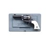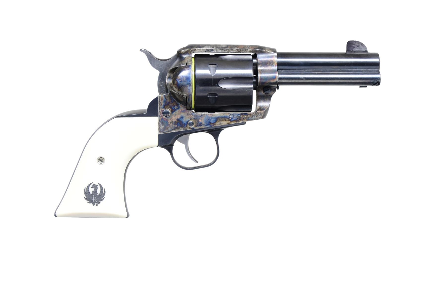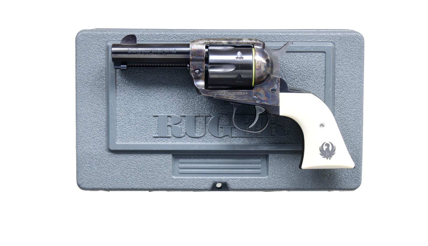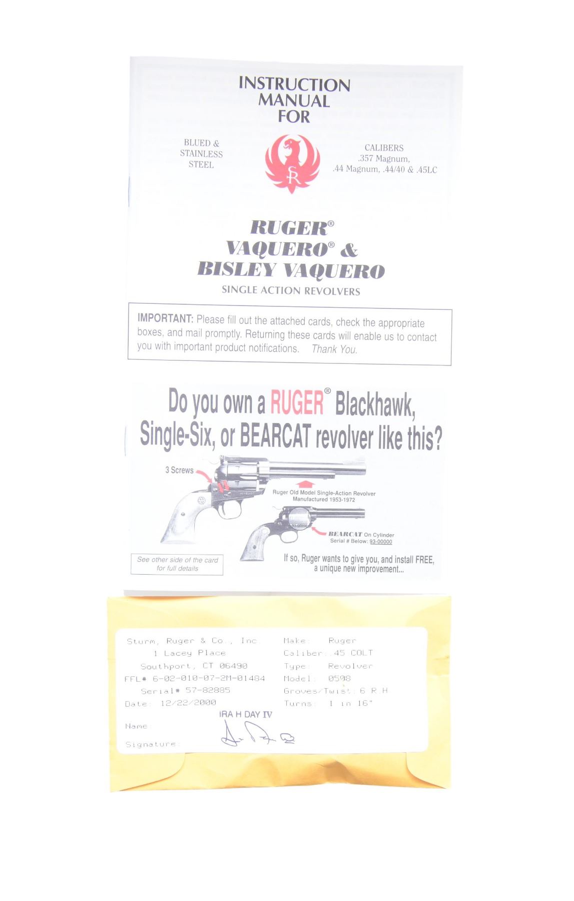 Cal. 45 Colt. S# 57-82885. Mfg. 2001 as Model 00508 / Catalog No. BNV-453-SI. The Ruger Vaquero is a single action revolver featuring a case-hardened finish on the frame and blued finish on the barrel and cylinder. The barrel length is 3.75 inches with a fixed front sight and a fixed rear sight. It has white synthetic grips with the Ruger emblem. The frame is a standard Ruger frame without special naming. The cylinder holds six rounds and is fluted. UNATTACHED ACCESSORIES: factory box and instruction manual. CONDITION: revolver is in near excellent overall condition with 98% of its original finish remaining. The barrel retains 98% of its blued finish. The frame also retains 98% of its case-hardened finish. The grips are in excellent condition. The bore is bright and shiny with strong rifling. MODERN. (24-2987/MD). $400-600.