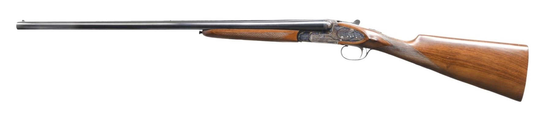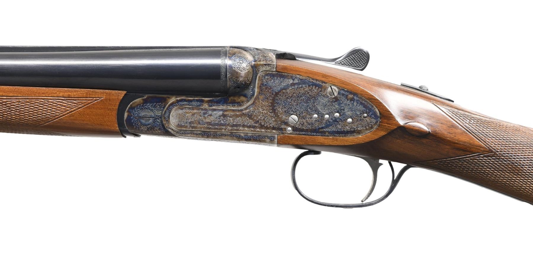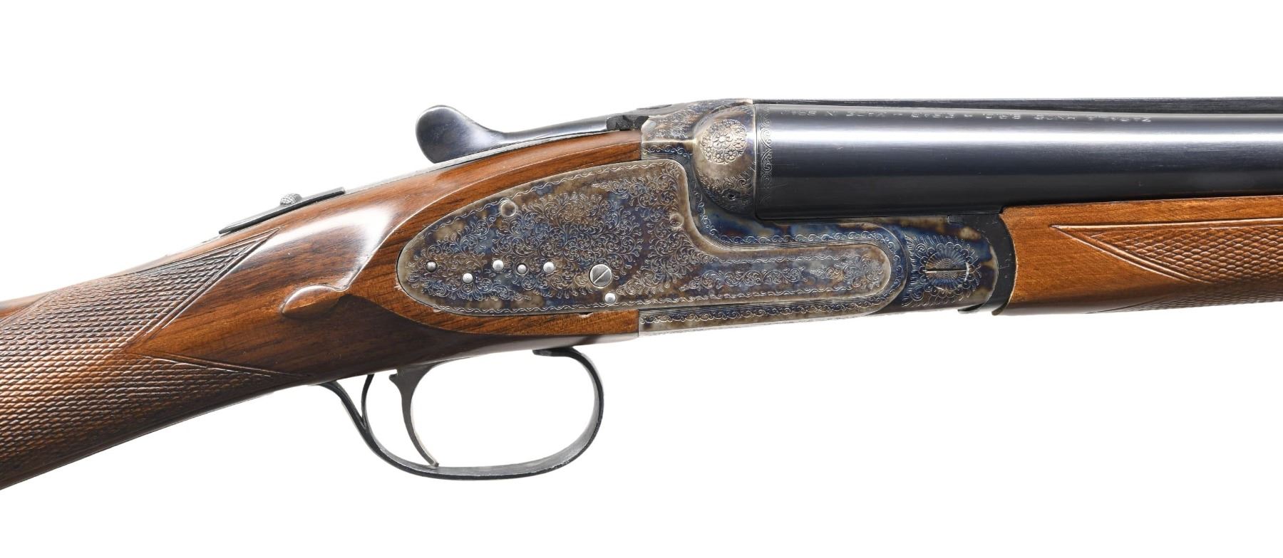 Cal. 16 ga 2 3/4". S# 502164. Bbl. 26" w/ fixed Mod & full chokes. White target front sight w/ white mid bead. Case colored boxlock action features cocking indicators, single non-selective triggers & ejectors. Action has full coverage rose & scroll ornamentation. Splinter forearm & straight grip walnut stock w/ checkering & oval nameplate in toeline. LOP: 14" to the checkered butt. DAC: 1 7/16". DAH: 2 3/8". Neutral cast. WEIGHT: 6 lbs, 6.6 oz. UNATTACHED ACCESSORIES: original box containing warranty papers w/ certificate of authenticity dated March 26th, 1992. CONDITION: metal retains over 98% original finish. Original wood finish shows small marks. Very good bright bores. (24-4019/DS). MODERN. $800-1,200.