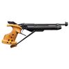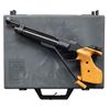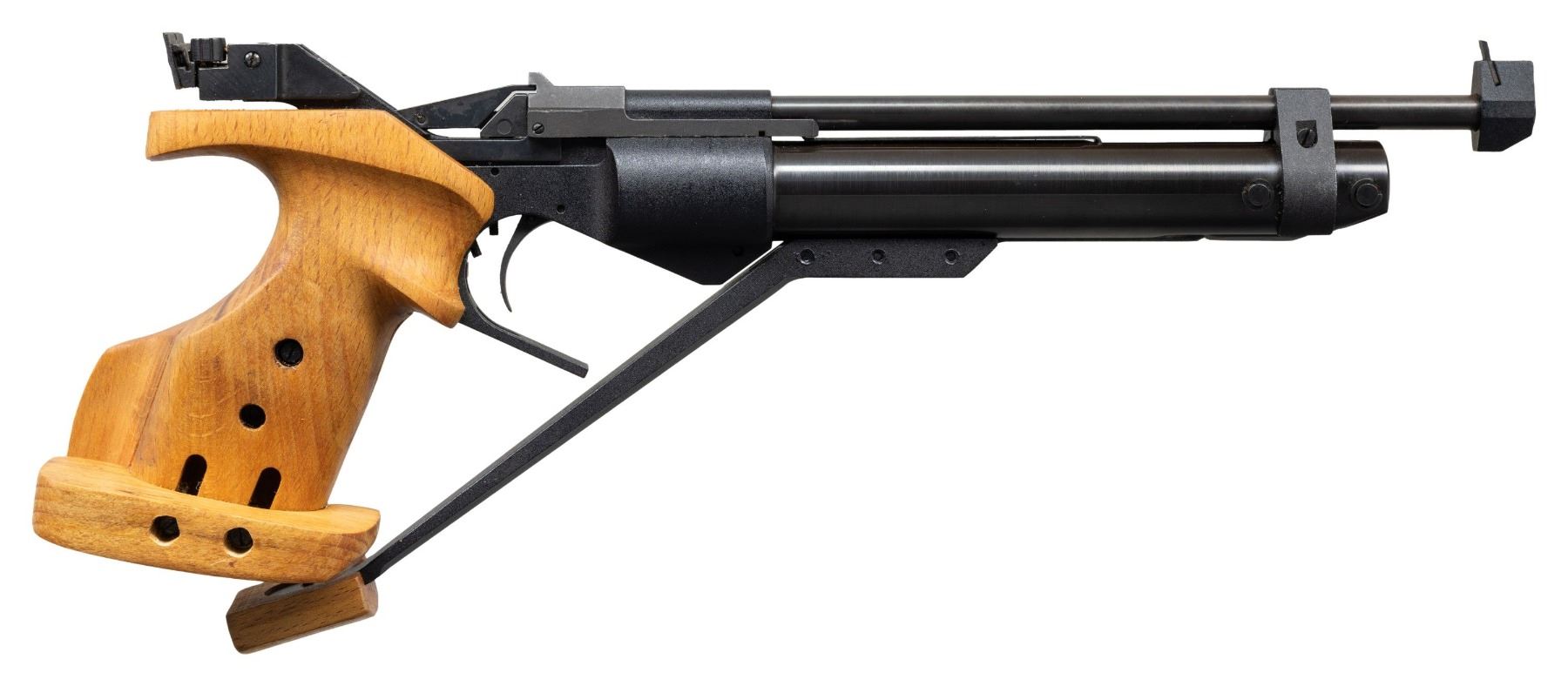PRECISION AIR PELLET PISTOL. Cal. .177. S# 943026. Bbl. 11". IZH-46 single shot under-lever precision air pellet pistol mfg. in Russia at the Izhevsk Mechanical Plant and retailed under Baikal. Left side of the receiver is marked with Cyrillic characters and "-46" (IZH-46) and the S#. Underside of lever is marked "BAIKAL MADE IN RUSSIA". Alloy components exhibit a textured matte black finish, with steel parts exhibiting a blue finish. Frame is mounted with 2-piece plain wood thumbrest grips. Under-lever terminates in a wood block. Post front sight and adj. square notch rear sight, with adj. trigger. UNATTACHED ACCESSORIES: factory gray polymer hard case, containing cleaning rod, disassembly tool, spare rear sight plate, tin of pellets, and a matching Izhevsk Mechanical Plant paper. CONDITION: excellent, with few light superficial handling marks. Proper manual mechanics. Mirror bore. Grips are excellent. Case shows some superficial marks from handling and storage, but otherwise remains sound. (02-24386/MLW). NON-GUN. $200-400.