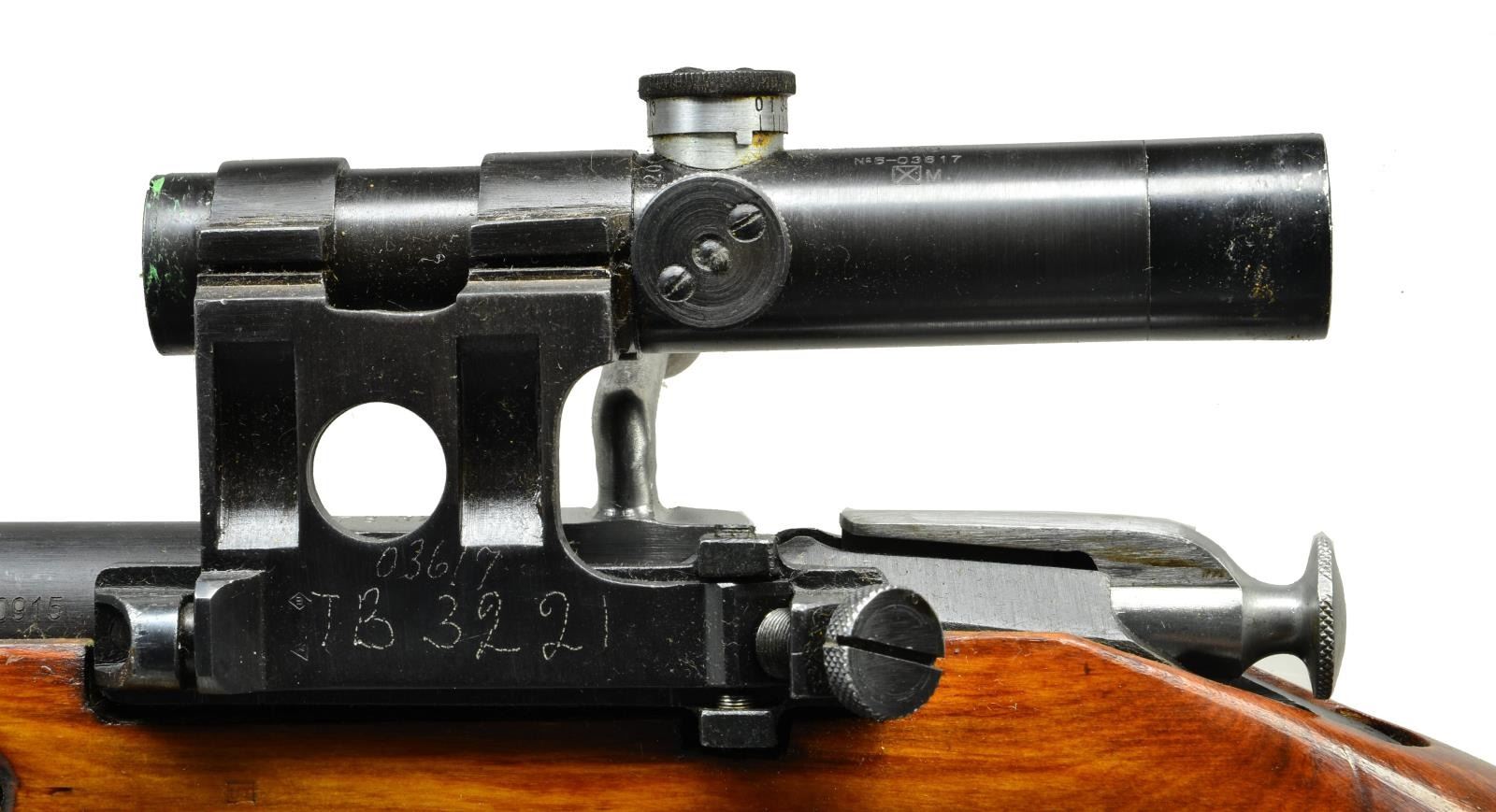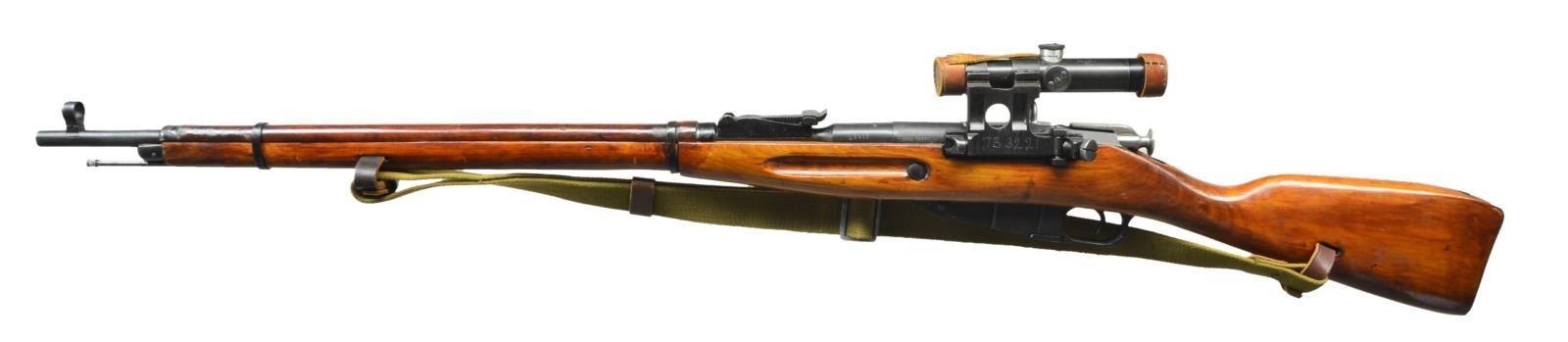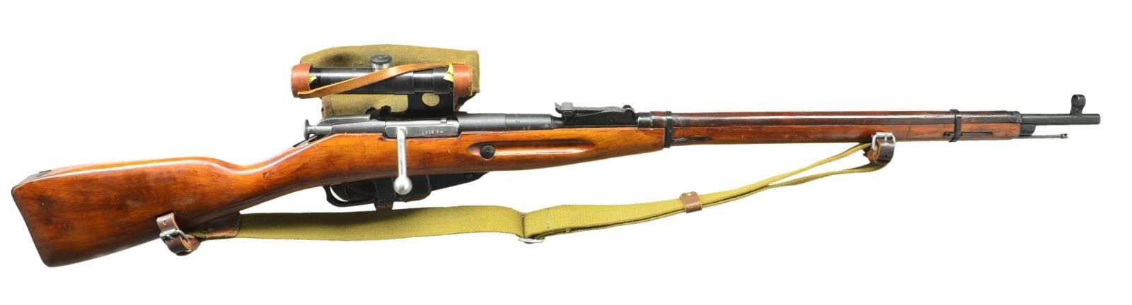 SNIPER RIFLE. Cal. 7.62x54R. S# MOR0000915. Bbl. 28 1/2". Import marked on bottom of bbl. Original S# TB3221 matches on bbl., bolt, scope mt., buttplate & floorplate. Rifle imported by I.O. INC MONROE NC & marketed according to accompanying manual & certificate book as a hunting rifle. It is equipped w/ a PU telescopic sight in standard sniper type configuration. Rnd. receiver marked only w/ S#. Bbl. is marked over chamber w/ hammer & sickle in wreath, arrow inside triangle indicating manufactured by Izhevsk Arsenal dated 1943. Marked on left side w/ additional number "U3617". Turn down bolt handle. Tangent rear sight graduated to 2,000 meters. Post front sight w/ protective hood. Cleaning rod is present. Hardwood stock set. Handle retained by solid bands w/ band springs. Green web sling w/ leather collars. Buttstock marked on right side w/ encircled "OF". PU telescopic sight in sniper type mt. Scope is marked on top w/ star, hammer & sickle, 91/30, No 5-03617, & boxed "X" & "M". Pointed post reticle w/ horizontal cross bars. UNATTACHED ACCESSORIES: include clamp on muzzle break, leatherette pouch w/ cleaning & take down tools, green canvas scope cover, owner's manual w/ packing & acceptance certificate printed inside dated May 22, 2012, leather scope caps, box of 20 Russian 182 gr. FMJ ammunition. Padded carrying case. CONDITION: stock set has arsenal rework type finish w/ light wear, scratches & handling marks. Metal has 90% arsenal rework dark finish w/ scattered scratches & handling marks. Near excellent shiny bore. Scope & mt. have high degree of original finish w/ light wear & scattered scratches. Optics appear clear & serviceable. PROVENANCE: from the estate collections of Charles P. Obremski. (22-1409/RW). CURIO. $800-1,200.