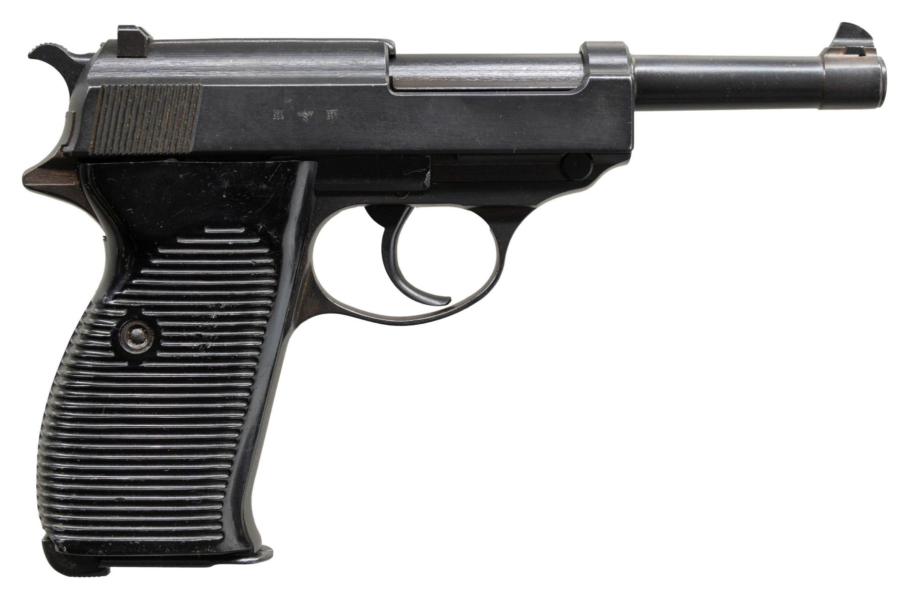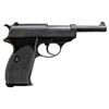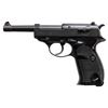 P.38 SEMI-AUTOMATIC PISTOL. Cal. 9x19mm. S# 2290b. Bbl. 4 7/8". Standard configuration P.38 semi-automatic pistol mfg. by Walther in 1942. Left side of the slide is marked "P.38", followed by Walther's mfg. code and the 2-digit year of mfg. "ac/ 42", as well as the S#, with Walther Eagle/359 acceptance proofs and an eagle firing proof marked on the right. Left side of the frame is stamped with an "X" above the S#, indicating Russian capture. Metal components exhibit a Russian reapplied blue finish. Frame is mounted with 2-piece grooved black Polymid 6 grips. Blade front sight with U-notch rear sight. All serialized parts are matching and include the frame, slide, bbl., and locking block. MAGS: 1 blued 8-rd. marked with a Mauser Eagle/135 proof on the spine. CONDITION: metal components retain the vast majority of their Russian reapplied blue finish, exhibiting some spots of light edge wear, with some spots/patches of light surface oxidation overall. Dark pitted bore, retaining fair rifling throughout. Proper manual mechanics, to include the safety / decocking lever. Grips show scattered superficial marks from handling and storage, but otherwise remain sound. (25-4668/MLW). CURIO. $700-1,100.