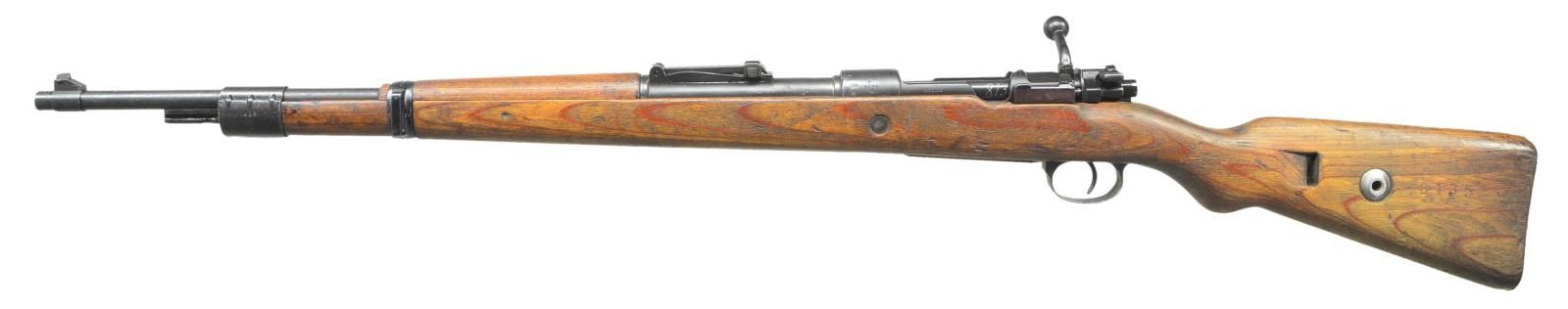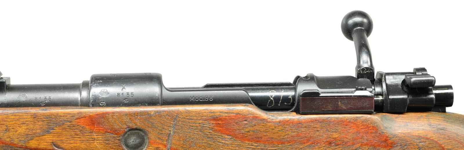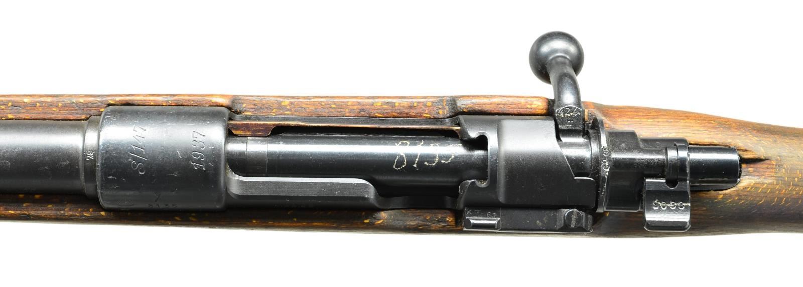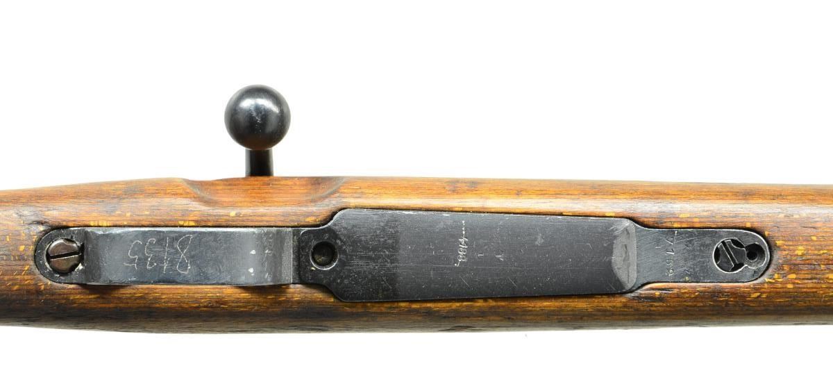 Cal. 8mm Mauser. S# 8135e. Bbl. 23 1/2" w/ import marking. Bbl. & left side of butt have matching numbers. Bolt & bottom of trigger guard have matching electro pencil numbers. Other parts are mismatched. Top of receiver has "S/147" JP Sauer code & 1937 date. Right side of receiver has Weimar eagle 214 Waffenamts. Left side of receiver has Weimar eagle, serial number & Russian "X" marking. Tangent rear sight graduated to 2000m. Inverted V-front sight. Laminated stock set w/ flat buttplate. Left side sling swivel. No cleaning rod or small set screws present. CONDITION: stock set appears lightly cleaned w/ scattered dings & handling marks. Metal retains 90% Soviet arsenal rework blue w/ scattered silvering & thinning. Very good bore w/ some light frosting. (22-3613/MJC). CURIO. $800-1200.