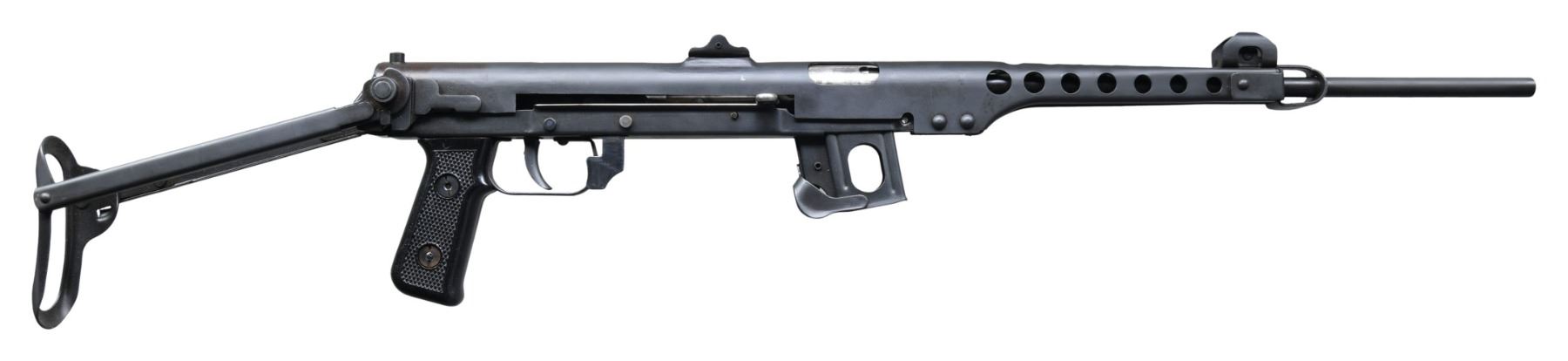 MANUFACTURING GROUP. Cal. 7.62x25mm. S# SMG08-027. Bbl. 16". A closed bolt, semiautomatic carbine version of the famous Russian submachine gun. Fixed metal stock. Matte black finish on all exposed metal surfaces. Unique ventilated barrel shroud which is integral to upper receiver portion, terminated w/ a loop style muzzle brake, reminiscent of those found often on artillery. The barrel continues through the brake for an additional 6.5". Protected post front sight w/ fixed rear sight consisting of folding notch w/ 2 positions, marked "10" & "20". Right side reciprocating charging handle integral to bolt. Safety located on right side, forward of trigger. 2-piece black plastic pistol grips. Top folding shoulder stock is present but has been rendered inoperable. CONDITION: Finish coverage complete & consistent w/ some thinning, primarily on the left side & in areas of mechanical intervention. Bright bore w/ strong rifling. Fire control mechanism appears to function correctly when cycled by hand. (25-2331/JZ). MODERN. $400-600.