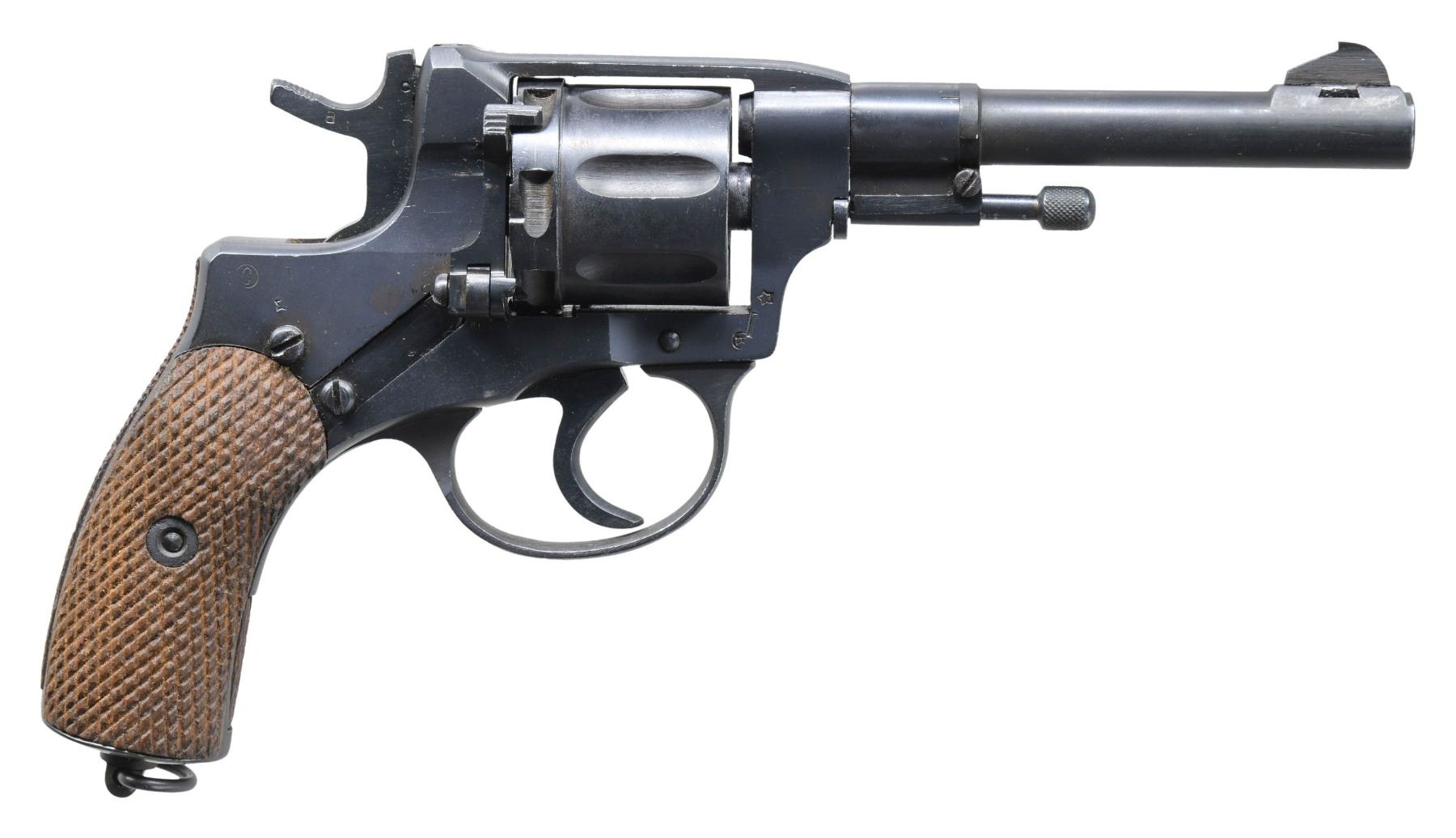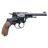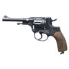 DOUBLE ACTION REVOLVER. Cal. 7.62x38mmR. S# 17011. Bbl. 4 1/2". Model 1895 Nagant double action revolver mfg. at the Tula arsenal in 1931 and later imported by PW Arms. Left side of the frame is marked with PW Arms import markings, followed by Tula's arrow within a star insignia above "1931". Various Russian proofs are present overall. Metal components exhibit an arsenal reapplied blue finish. Frame is mounted with 2-piece checkered wood grips, as well as a checkered wood panel on the front and rear grip straps. Left grip panels checkering is notable coarser than the right. Butt is fitted with a lanyard stud and ring. Dovetailed blade front sight with U-notch rear sight. CONDITION: metal components retain the majority of their arsenal reapplied blue finish, showing light edge wear, some scattered superficial handling marks, as well as areas of light surface oxidation overall. Very bright bore, exhibiting some hardened grease along the lands and some light pitting, while retaining well defined rifling throughout. Proper manual mechanics in SA and DA. Grips are very good overall. (25-4792/MLW). CURIO. $300-500.