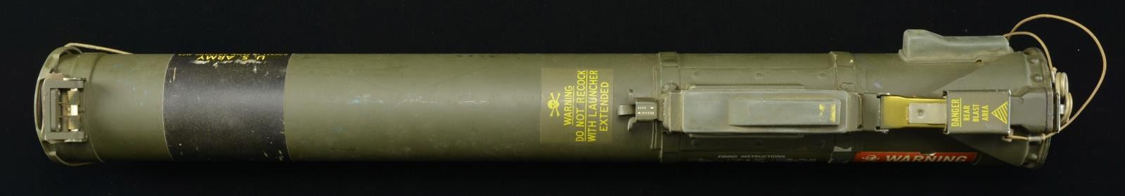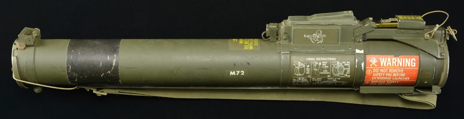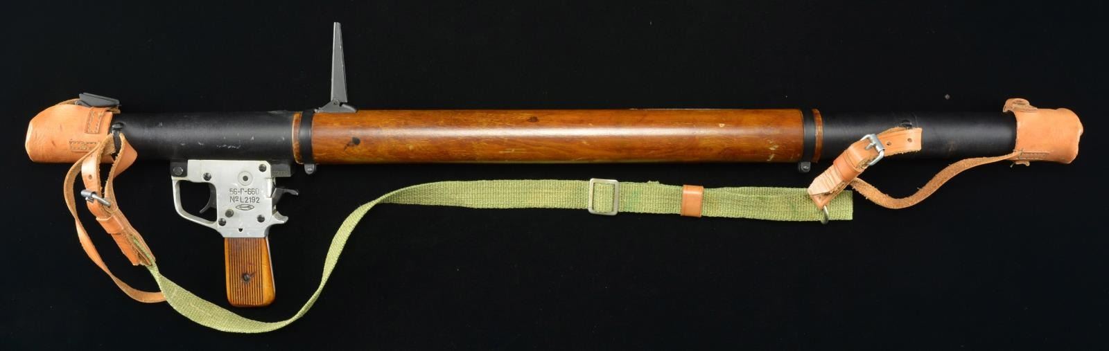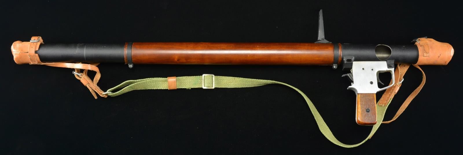 1) RUSSIAN RPG2. Manufactured at Kovrov Arsenal, Russia. Trigger group marked "56-r-660" w/ arrow in an oval below serial number. Deactivated via 36mm hole in high pressure chamber & welded pin through tube in firing mechanism. 37.5" Oal. 19" thin wood heat shield. Front & rear folding sights. Green canvas & leather sling. Front & rear leather end caps. CONDITION: sights, trigger & hammer function as intended. Firing mechanism has been drilled & pinned to prevent insertion of munitions. Tube painted flat black. Wooden heat shield in nice condition w/ typical impressions. Sling & end caps appear like new.
