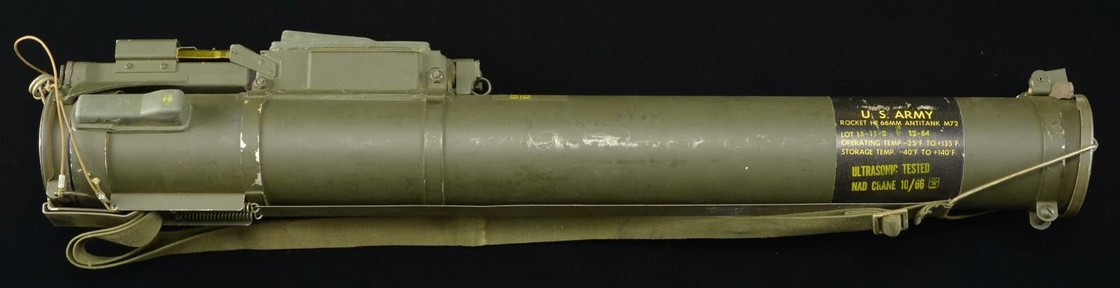 2) 66MM M72 LAW ROCKET LAUNCHER. Dated 12/64 for US Army. 25" Oal folded. 35" Oal when deployed. Folding sights function correctly. Complete w/ end caps & sling. All original labels appear present. CONDITION: fired tube in nice condition. Exterior green paint is complete & consistent w/ a few small areas of flaking. Original labels are clear & easy to read. (02-16428-1/JZ). $300-600.