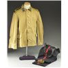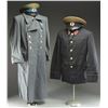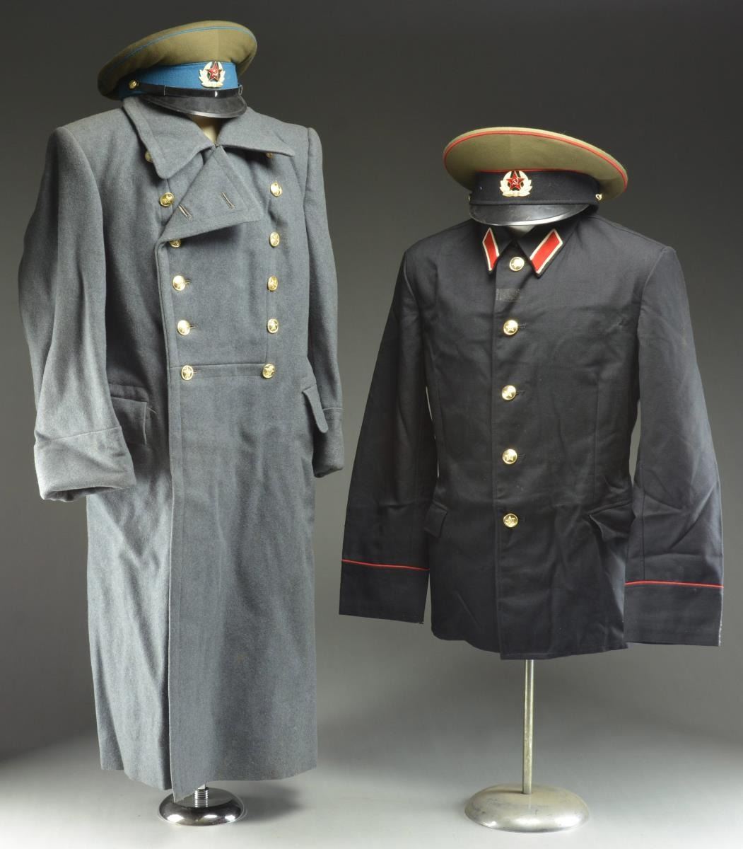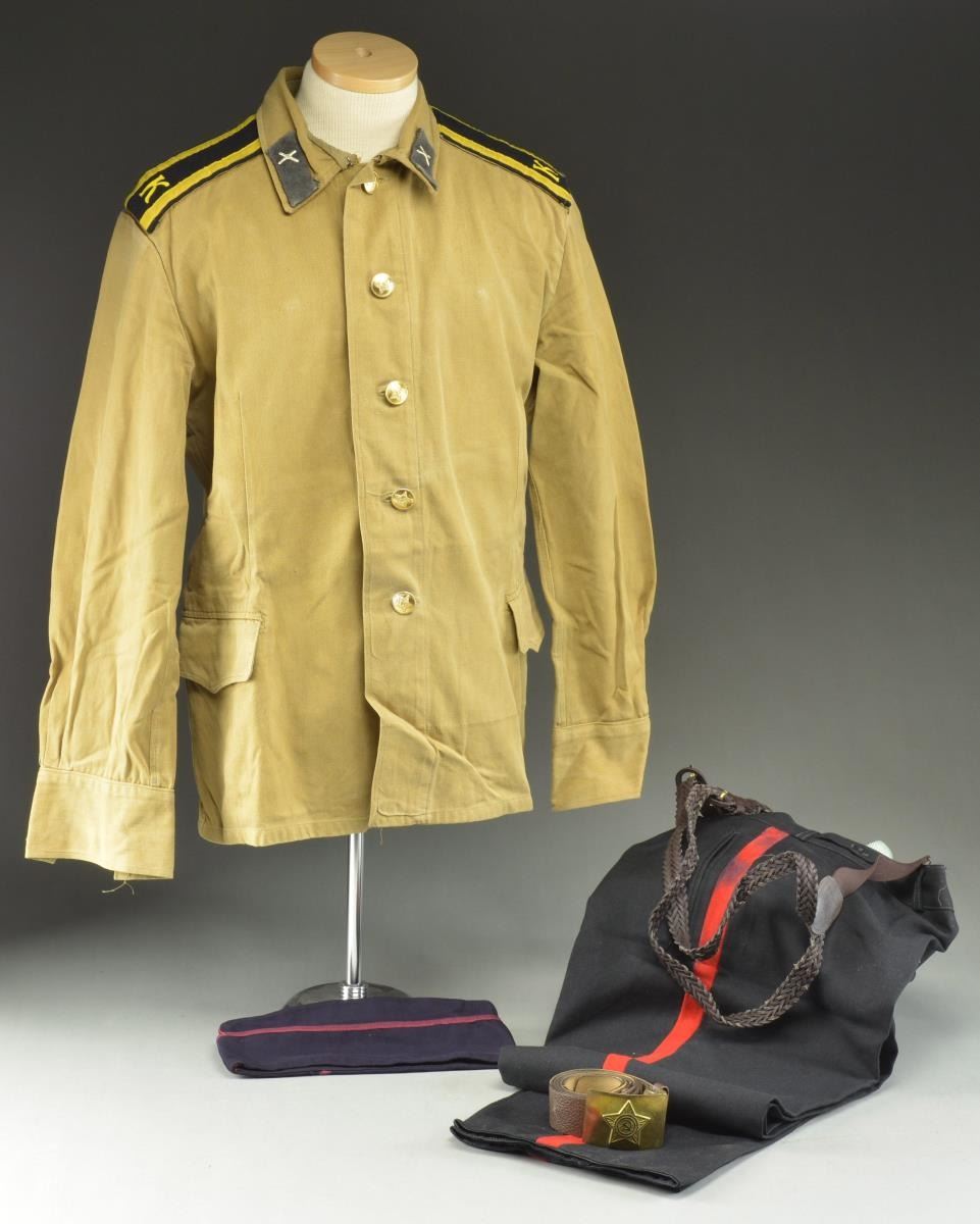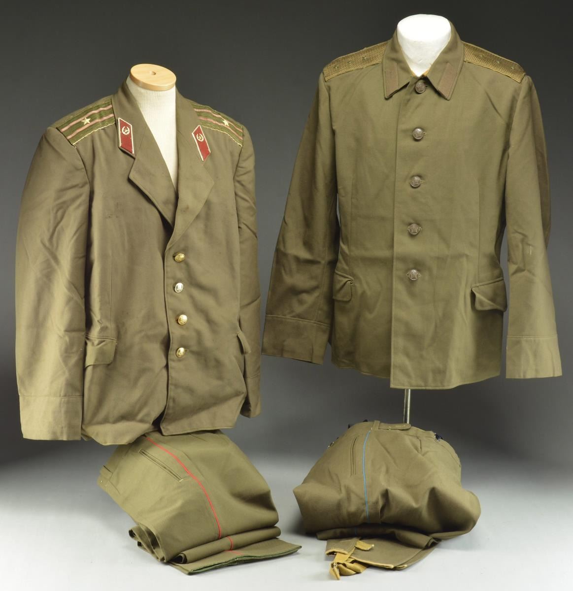 This fine group includes an Army tropical uniform for a sergeant of artillery. Uniform is tan cotton with black & yellow shoulder straps & gray collar tabs. / 1 Army major’s uniform tunic & pants. Drab green cloth uniform with drab green shoulder straps featuring 2 pink stripes & 1 metal star. Pants have a narrow red piped stripe down each leg. / 1 Gray enlisted double-breasted heavy wool overcoat. / 1 Pilots coat & pants for a Colonel-General. Drab green cloth uniform with bronze colored cloth shoulder straps, each having 3 stars. Brown wool collar tabs void of insignia. Pants have a blue piped stripe down each leg. / 1 Black uniform tunic & pants. Collar has white bordered red collar tabs. Pants have a 3/4" red stripe down each side. / 1 Enlisted visor cap with green crown featuring blue band & piping. Faux leather chin strap & red enameled front plate. / 1 Enlisted visor cap with green crown featuring red piping and a black band. Red enameled front plate, but no chin strap. / 1 Dark blue overseas cap with red trim. / 1 Enlisted gilded brass belt buckle on incorrect belt. CONDITION: items generally show light wear, except as noted. (02-16490-4/BF). $300-500.