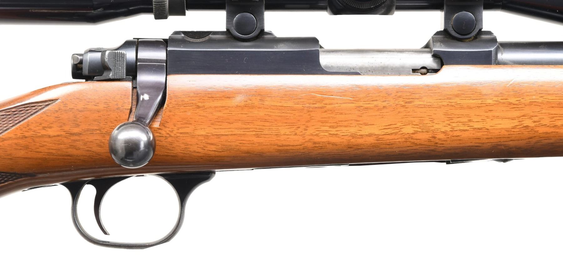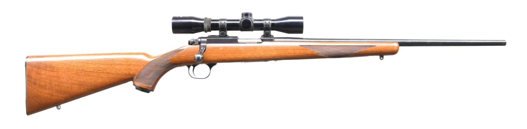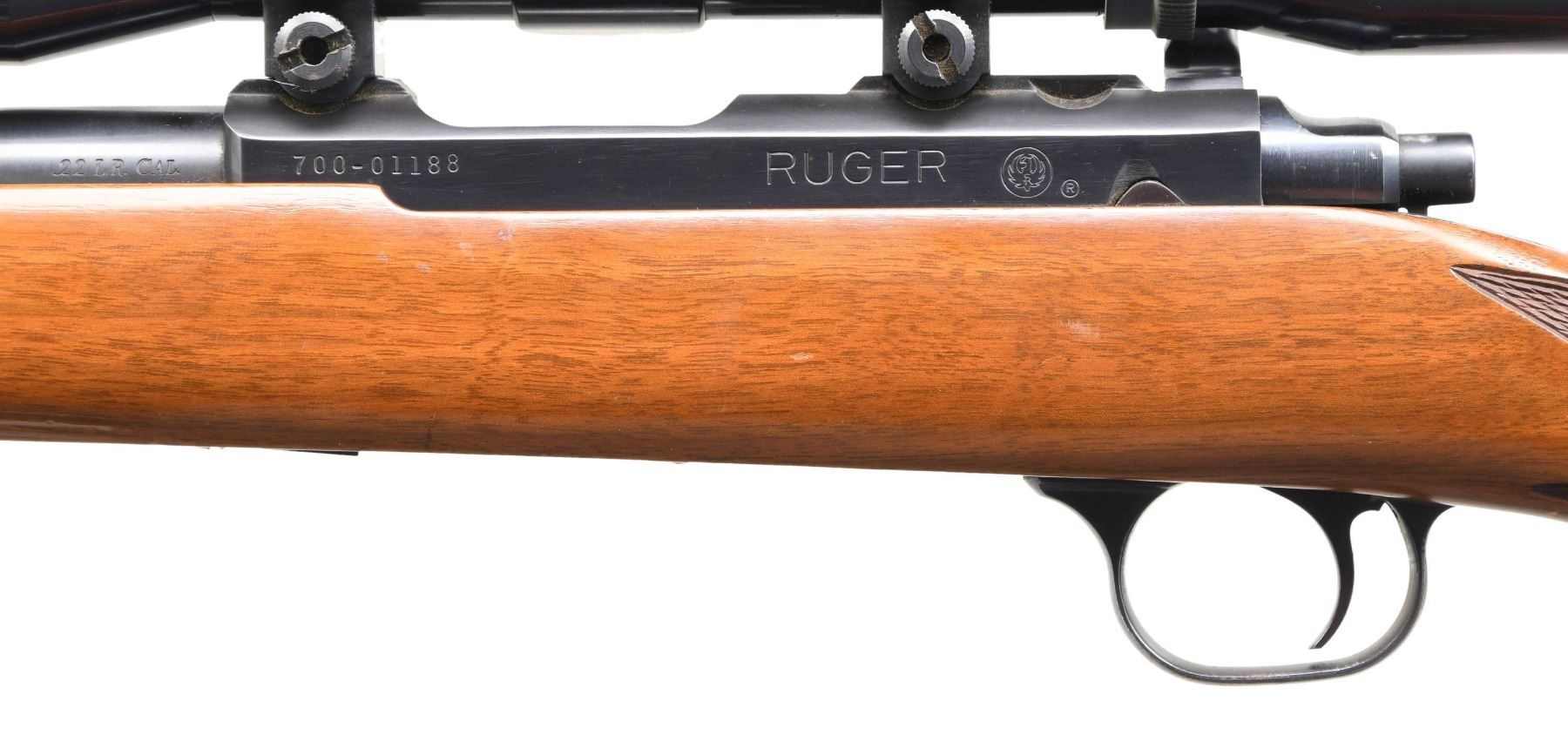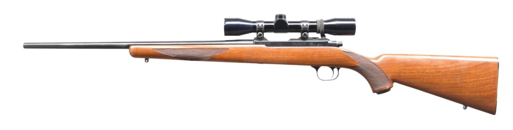 Cal. 22 LR. S# 700-01188 (mfg. 1984, first year of mfg.). Tapered 20" barrel without sights; caliber marking ".22 L.R. Cal.". Simmons 4x32 scope with duplex reticle on Ruger rings. Receiver has integral bases without "77/22" rollmark on left side of action. Checkered walnut stock with plastic Ruger grip cap & plastic Ruger buttplate. MAGS: NONE. CONDITION: over 95% blue with a few areas of pinprick oxidation & finish loss on barrel. Very good stock finish with scattered handling marks & areas of lightly worn finish. Bright shiny bore. Scope has very good finish with dent on ocular bell, optics appear serviceable. (24-4265/MD). MODERN. $500-650.