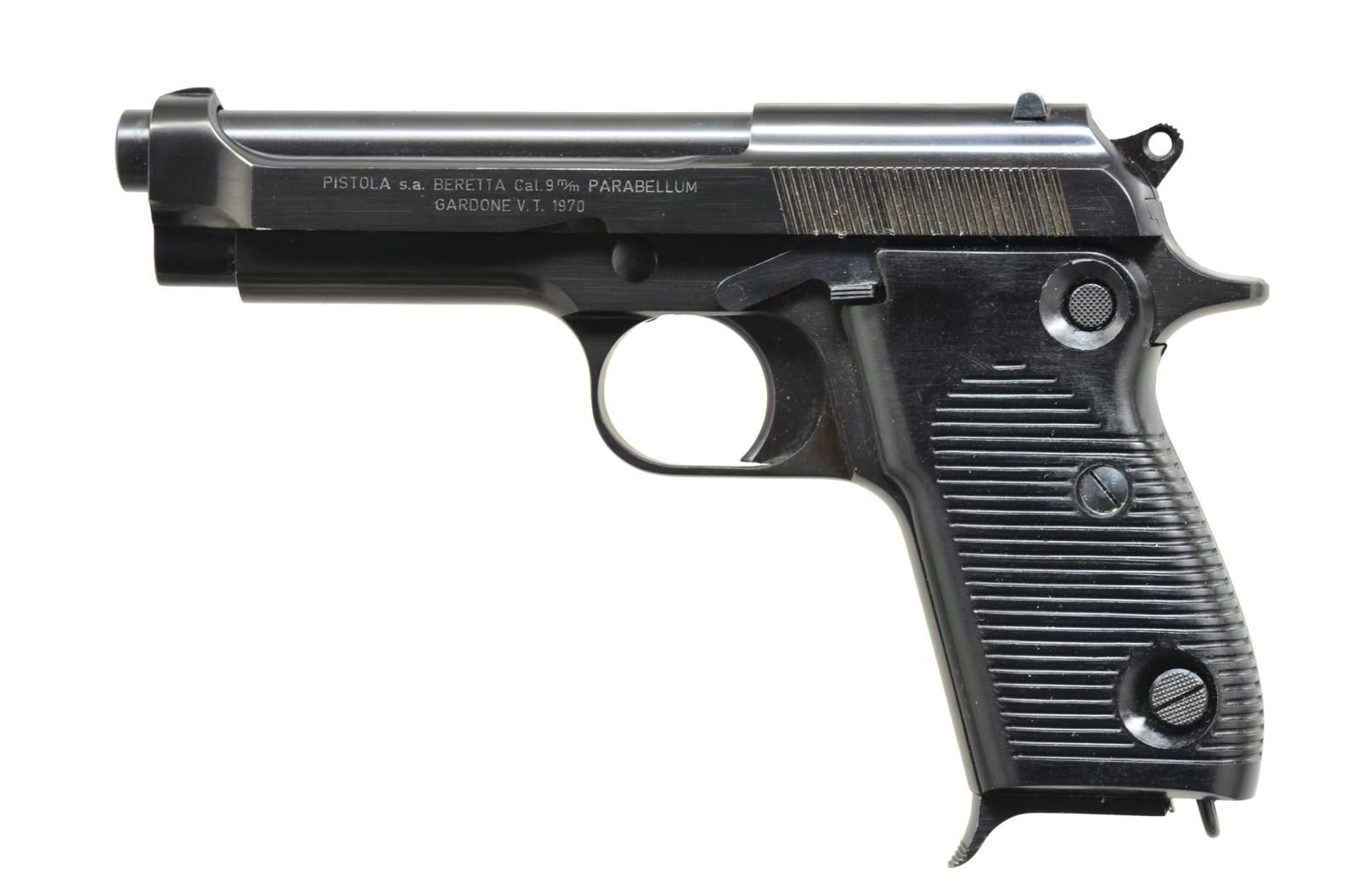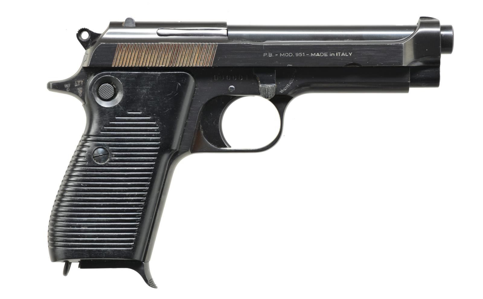 Cal. 9mm Luger. S# D00001. Bbl. 4 1/2". The very first gun from the D block of commercial M1951's that were sold in the US. Blued finish. Fixed sights. Push button safety located at the top rear section of the grips. Serrated black plastic grips w/ push button mag release located at the bottom left grip. Lanyard ring. MAGS: 2 - 8 rd w/ finger extension. UNATTACHED ACCESSORIES: Blue 2 piece unnumbered Beretta box. CONDITION: overall near excellent w/ only a few very minor handling marks. Lightly frosted bore w/ very good rifling. (20-4119/ZAL). MODERN. $500-700.