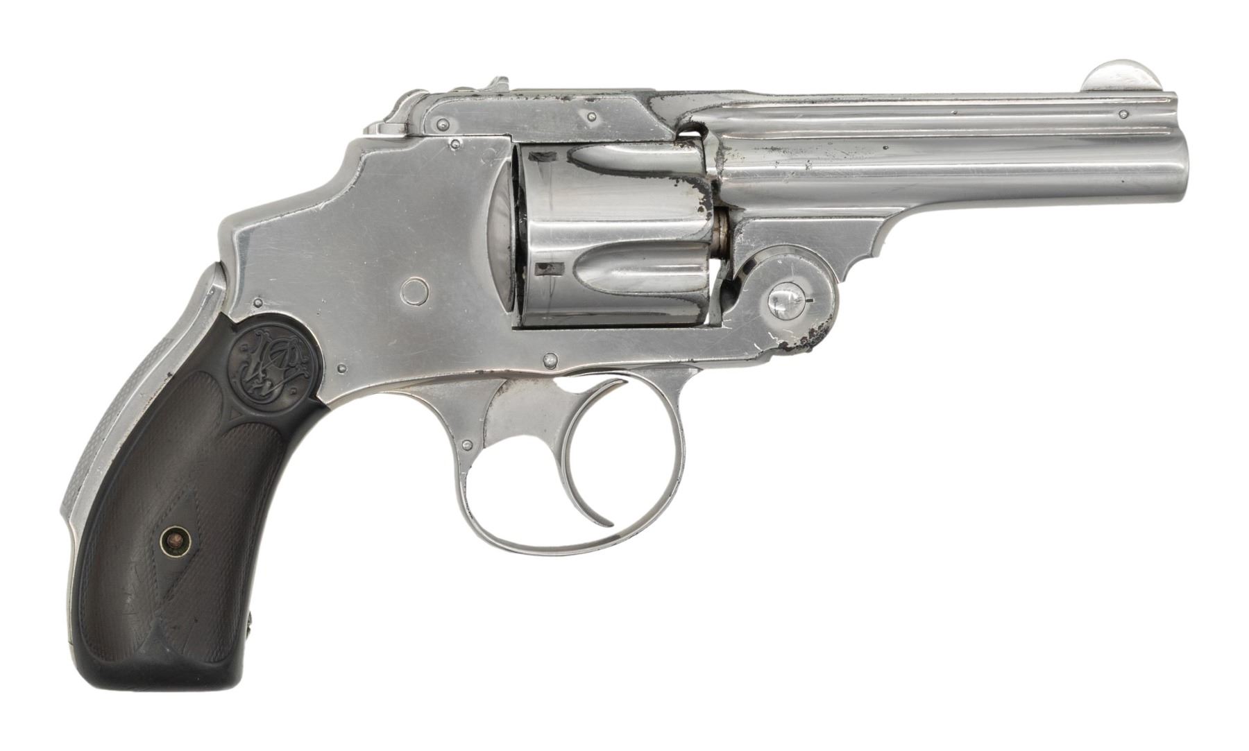Cal. 38 S&W. S# 42386. Bbl. 3 1/2". Round blade front sight. Fixed rear sight. Matching numbers on frame, bbl., & cyl. 5-shot cyl. Renickel finish. Checkered brown hard rubber grips with matching pencil numbered right panel & S&W monograms. CONDITION: grips show a few cracks most notable on left panel, overall heavy checkering wear,, some dings & handling marks. Metal retains 90% old renickel with scattered flaking, handling marks & oxidation. Action functions properly when hand cycled. Bore shows oxidation & dried grease but strong rifling. (01-28760/MJC). ANTIQUE. $300-400.