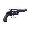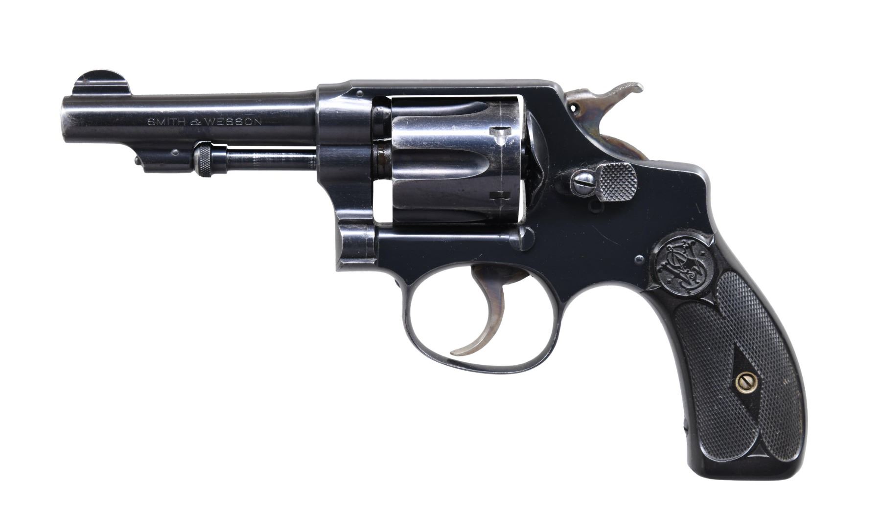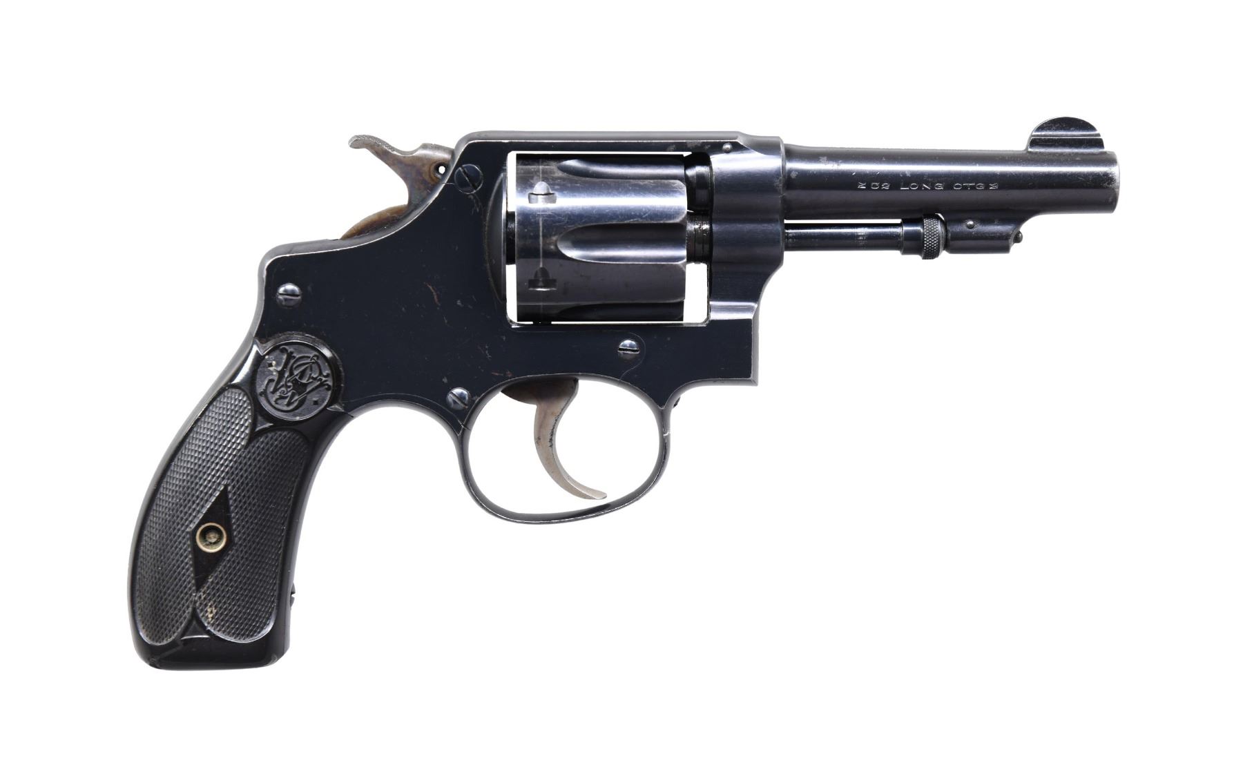 Cal. 32 S&W Long. S# 313720. Bbl. 3 1/4" pinned with integral 1/2 moon front sight; frame notched rear. Mfg. 1917-1942 (271,531 units) as 5 screw round butt I frame with blued finish and checkered hard rubber grips. Case colored smooth faced trigger and hammer with finely checkered spur. Locking lug on barrel with caliber on left and company info on right; patent info on top. Missing S&W logo below cylinder latch. Matching numbers on frame, barrel with "B" to indicate blued finish, cylinder, extractor and grips. No company info on lower right front of frame; occurred on some examples. CONDITION: very good general appearance that is likely refinished as logo is missing on frame. Occasional small areas of pinprick oxidation, slight thinning at muzzle and light cylinder turn line. Very good appearing grips having slight crack going through screw hole on left; not visible on exterior. Good bore with distinct rifling and light pitting. Fine mechanical functioning with proper timing. PROVENANCE: From the Lifelong Collection of George Staden S&W Member #3451. (25-62/NW). CURIO. $200-300.