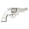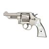 Cal. 38 Spl. S# S147980. Bbl. 4" w/ half moon front sight & frame notched rear. Mfg. 1955-1956 as "Pre Model 20" (1950-1966). 9,493 Mfg. (became Model 20 in 1957). 5 Screw N frame w/ standard case colored trigger & hammer. Matching numbered cyl., blued extractor & pinned bbl. Left bottom of frame under grip stamped "R" & "N" indicating factory renickeled. Jay Scott simulated pearl Magna style grips w/ dark wood backers. CONDITION: good plus general appearance w/ finish wear most noticeable at muzzle. General light marks throughout including cyl. turn line. Somewhat thin frame legend along w/ "Wesson" on left side of bbl. Peppery oxidation on hammer & trigger. Firing residue in action & face of cyl. Near excellent bore & grips. (20-2510/NW). CURIO. $500-800.