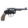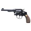 Cal. 38 Spl. S# 102501. Bbl. 5" pinned with integral 1/2 moon front sight; fame notched rear. Patent info on top of barrel plus caliber marking on left along with "U.S. SERVICE CTG'S". Yoke lock on barrel, 4 screw side plate plus 1 in front of trigger guard, detent in yoke to facilitate loading / ejecting, round butt K frame and checkered walnut grips having diamond centers and recessed brass medallions. Mfg. 1906-1909 (73,648 units) with blued finish plus case colored smooth faced trigger and hammer with finely checkered spur. Matching numbers on barrel, cylinder and extractor; grips pencil numbered to another revolver. Only frame marking is S&W logo on sideplate. Three punch dots in a row on lower edge of front strap. CONDITION: near excellent overall appearance with top quality factory style refinish. Light function wear and pin prick oxidation on hammer and trigger. Function wear on ejector rod not commensurate with overall finish. Fair to good bore with cleaned pitting throughout along with hint of wear. Beautiful grips with non factory replacement screw and left escutcheon. Fine mechanical functioning and proper timing. PPROVENANCE: From the Lifelong Collection of George Staden S&W Member #3451. (25-46/NW). CURIO. $350-500.