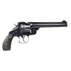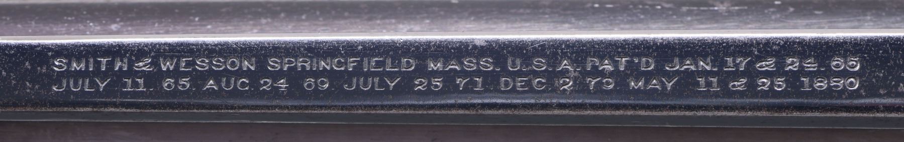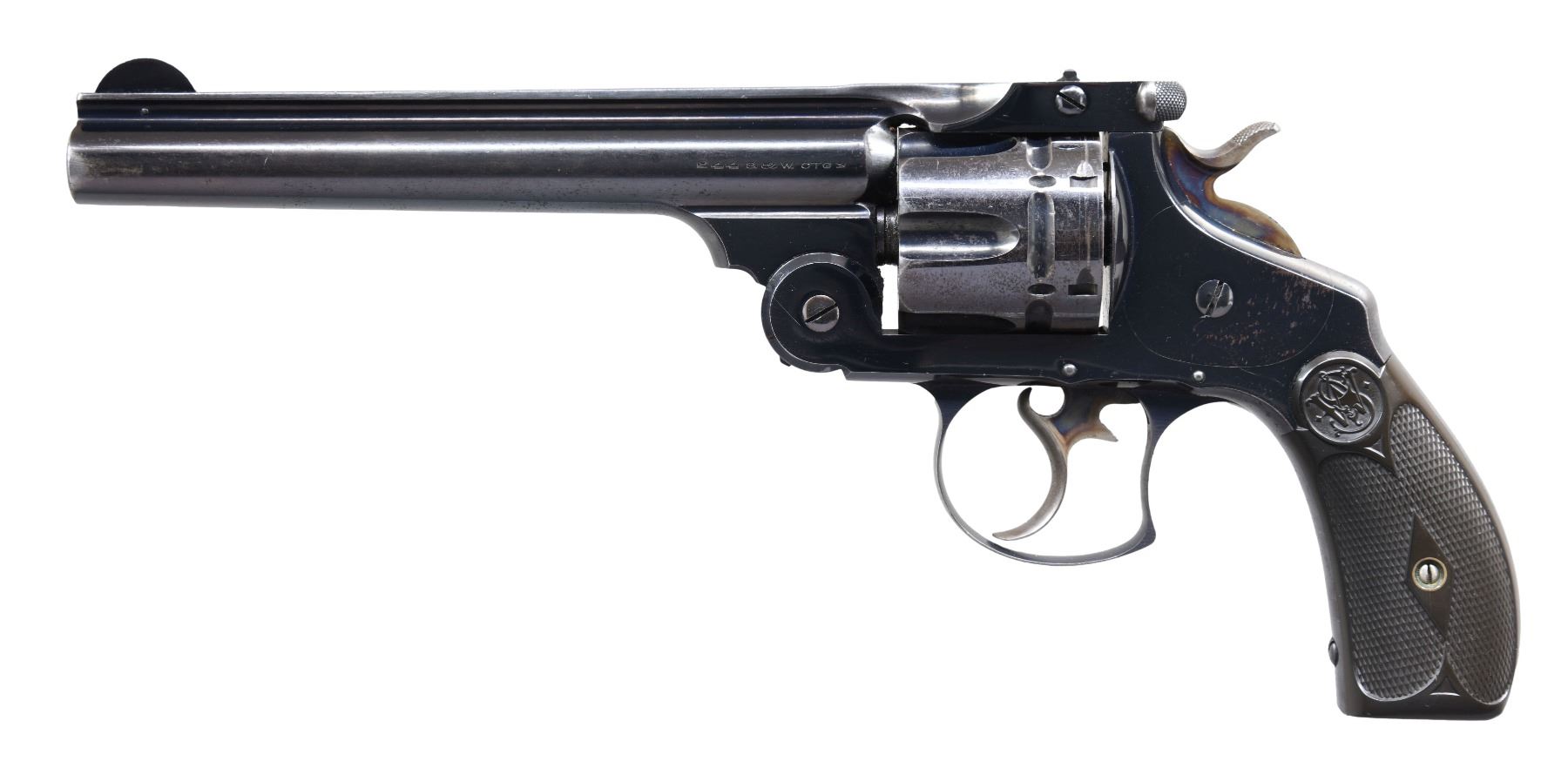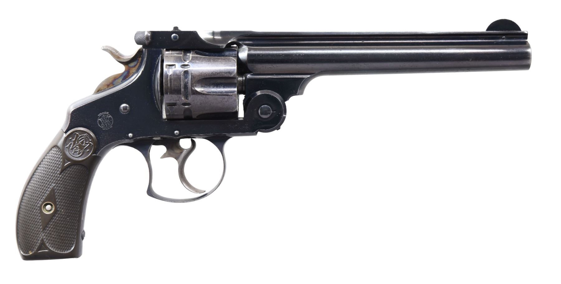 Cal. 44 S&W Russian. S# 44462. Bbl. 6 1/2" with pinned half moon blade sight plus notch in barrel latch at rear. Barrel rib has patent markings with last date of 1880. Mfg. 1881-1913 yet all frames made prior to 1899 being categorized as antiques. Total production of 53,590 units numbered 1-54668. Blued finish with vivid case colors on trigger and hammer. Often referred to as New Model Navy No. 3. Matching numbers on frame, barrel, barrel latch, cylinder and its checkered hard rubber grips. Fluted cylinder of double lock type is from later production measuring 1 9/16" in length. CONDITION: good plus overall appearance with factory quality refinish being glossy and bright but having pepper oxidation throughout. Especially nice case colors and near excellent, bright shiny bore. Light hand wear to grips. Three small notch like marks on left edge of butt that do not interfere with the grips. Solid barrel lock up with very minimal perceived movement. Proper cylinder timing on 5 of 6 chambers; very slightly "off" on one. PROVENANCE: From the Lifelong Collection of George Staden S&W Member #3451. (01-26248/NW). ANTIQUE. $2,500-3,500.