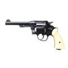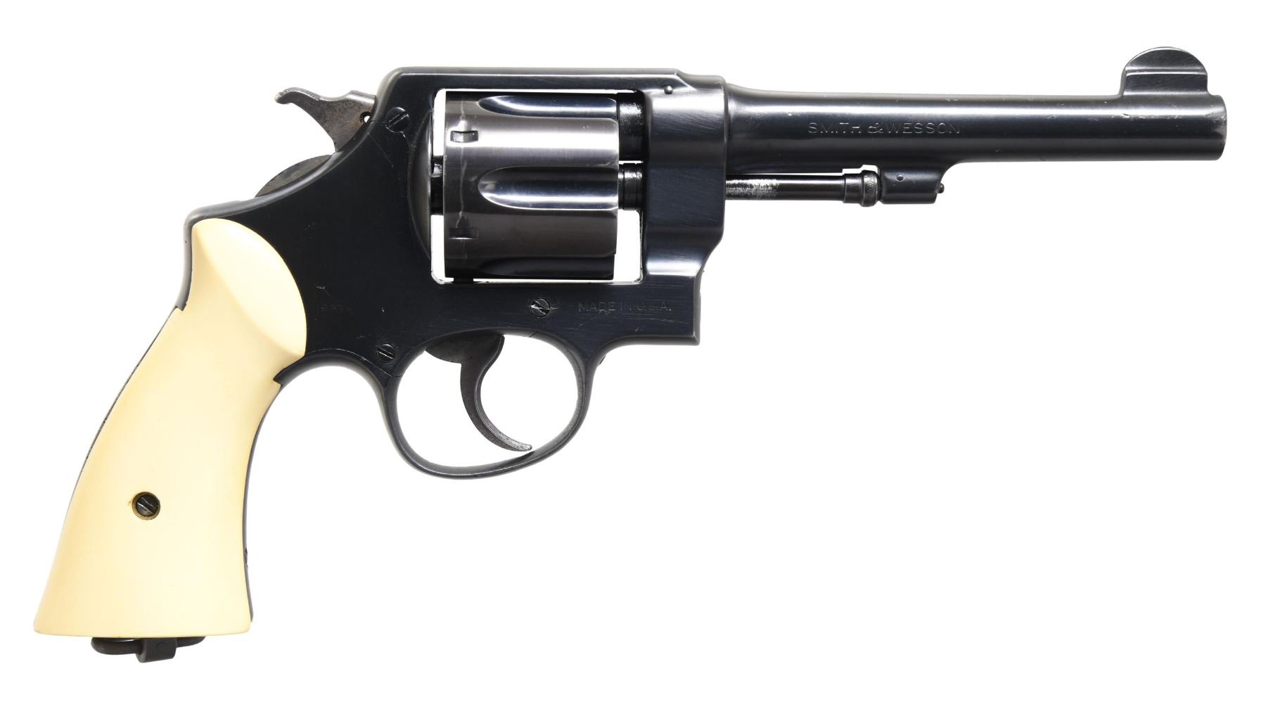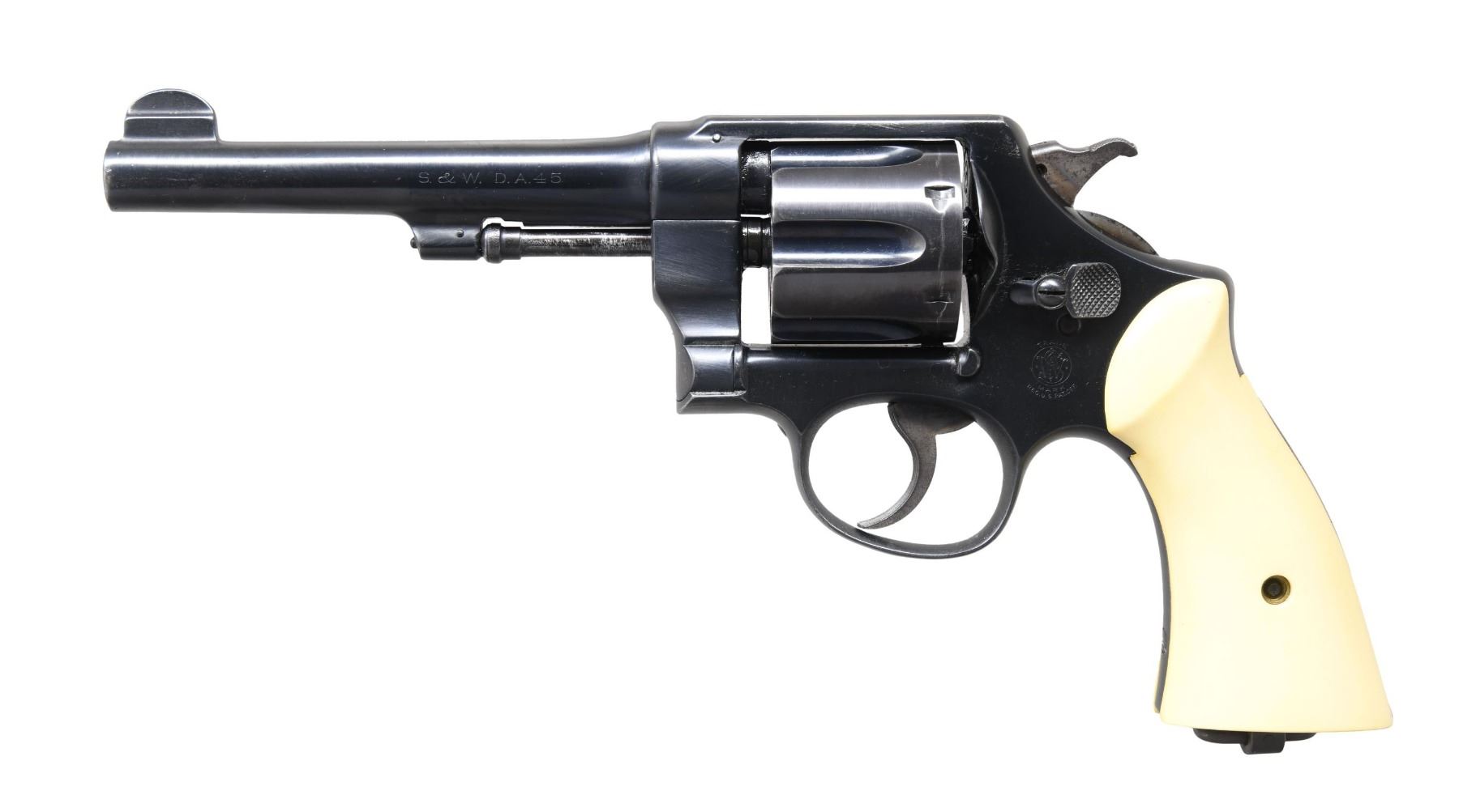 REVOLVER. Cal. 45 ACP. S# 185133. Bbl. 5 1/2" with half moon front sight plus square notched frame at rear. Mfg. approx. 1938 as part of 37,000 unit shipment to Brazil; second contract for 12,000 units in 1946. Sideplate has Brazilian crest and 1937 date; S&W logo on left side of frame plus 'MADE IN USA" on lower right front of frame. Identical features of US Army Model of 1917; 5 screw frame with lanyard swivel. Matching numbers on frame, barrel, cylinder and extractor. Approx. 14,000 imported late 1980's to 1990's; CAI import marked on underside of barrel. Smooth simulated ivory aftermarket grips. CONDITION: very good overall appearance with non factory refinish over light pitting. Good case colors on hammer with checkered spur and serrated trigger. Good bore with distinct rifling having frosted appearance. Lanyard swivel has grey finish. Near excellent grips. PROVENANCE: From the Lifelong Collection of George Staden S&W Member #3451. (25-64/NW). CURIO. $300-450.