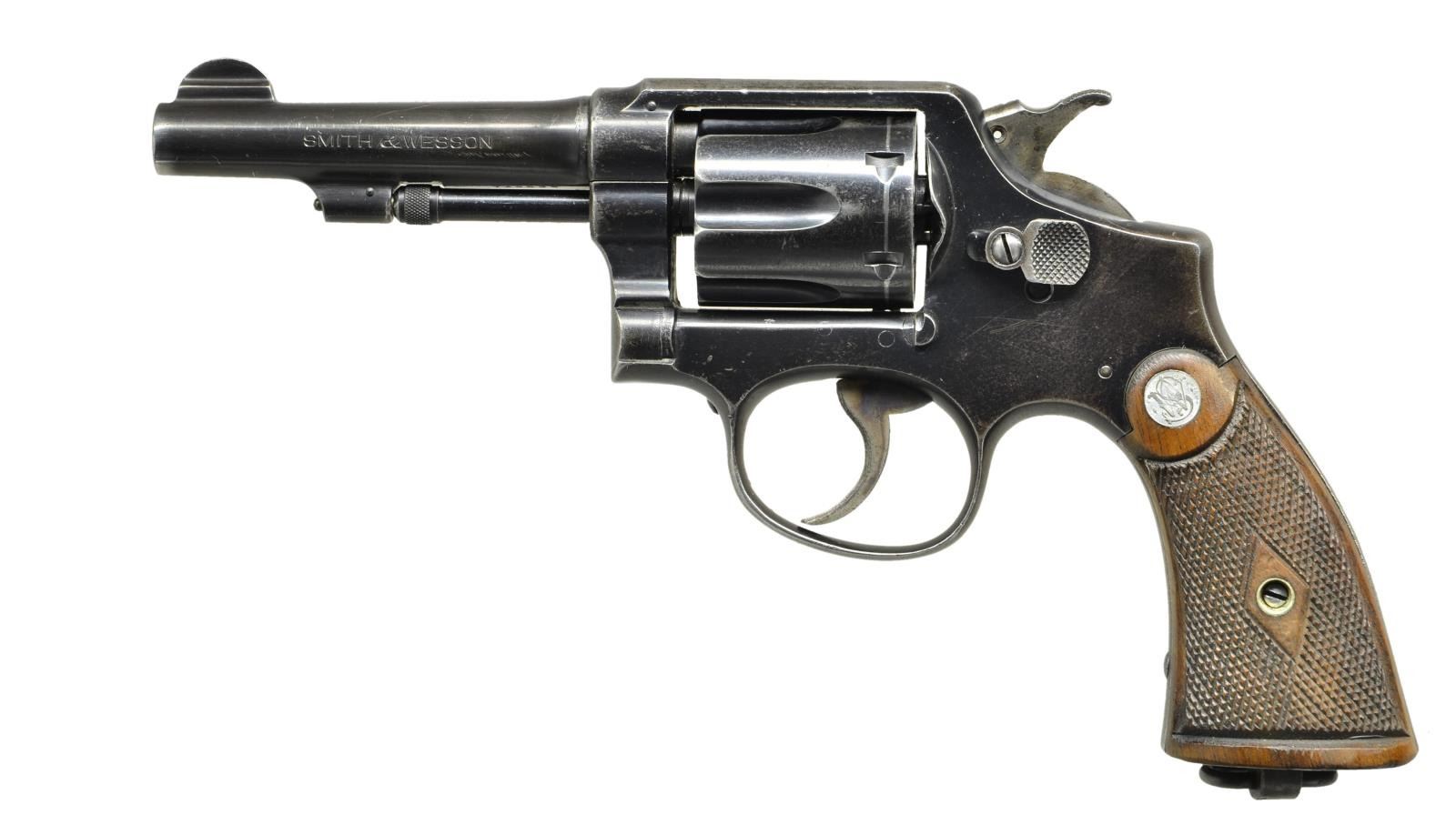 CORPS REVOLVER. Cal. 38 Spl. S# 748529. Bbl. 4" with integral semi-circular sight blade; standard factory markings on sides and top. Shipped March 10,1941 to U.S.N. Supplies Officer at Navy Yard in Washington, DC. within shipment of 300; 3,000 total (all shipped 1941) S# 748000 to 760000. 4th change in standard Model of 1905 that took place 1915 and made until 1942; continued to present date as Model 10. Diamond center checkered walnut unnumbered service stocks with silver medallions; square butt frame having lanyard loop on butt plus "U.S.N.C.R.C." on backstrap. Case colored trigger and hammer (grooved face). Matching numbered barrel, cylinder & extractor; 5 screw K frame. UNATTACHED ACCESSORIES: factory letter dated June 25, 2011 confirming this description; other facts from S&W reference books. CONDITION: good general appearance with areas of cleaned finish being most prominent on backstrap; typical of firearm around salt water environment. Cylinder turn line and high edge wear along with light marks throughout. Very good appearing grips with light marks on edges at butt. Good to very good bright bore with very faint pitting near muzzle. (22-6050/NW). CURIO. $750-1,000.