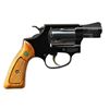 Cal. 38 Spl. S# J488235. Bbl. 1 7/8" pinned w/ serrated blade sight plus frame notched rear. Mfg. 1976-1977 (1951 to date) as 5 rd. alloy J frame model w/ square butt & checkered walnut Magna grips (matching stamped numbered). Case colored standard hammer & trigger. UNATTACHED ACCESSORIES: good matching labeled blue 2 piece box plus paperwork & cleaning rod w/ brush. CONDITION: all aspects near excellent w/ new unfired appearance. (21-4209/NW). MODERN. $500-750.