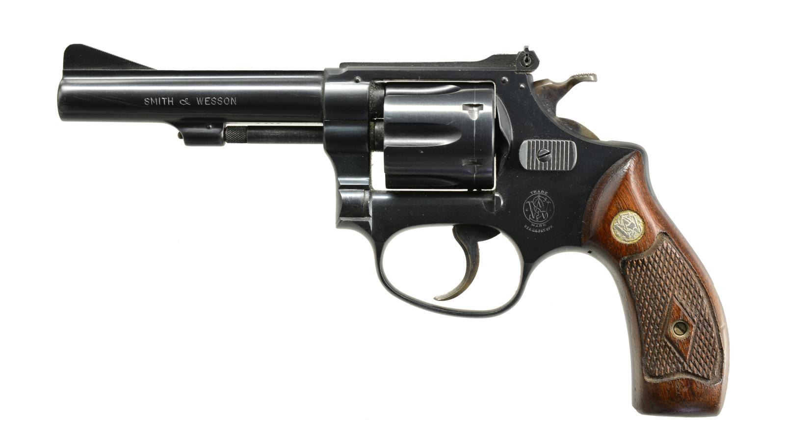 Cal. 22 LR. S# 7745. Bbl. 4". Mfg. 1954 as pre Model 34 (Model 34 began 1957). Low number of example w/ all appropriate early features including flat latch, Baughman style front sight & Micrometer rear. Standard case colored hammer & trigger. Rnd. butt J frame w/ 4 screw sideplate. Pinned bbl. & recessed cyl. Matching numbered bbl., cyl., extractor & diamond center checkered walnut Magna grips. CONDITION: very good to excellent overall appearance w/ noticeable cyl. turn line & very slight thinning at muzzle. Near excellent bore, chamber & grips. (20-2143/NW). CURIO. $750-1,000.
