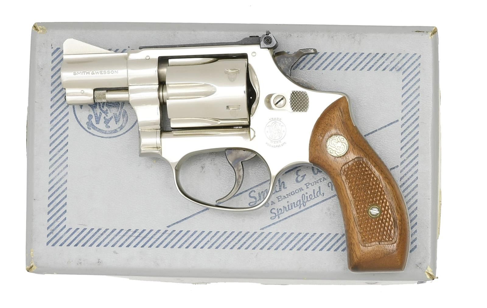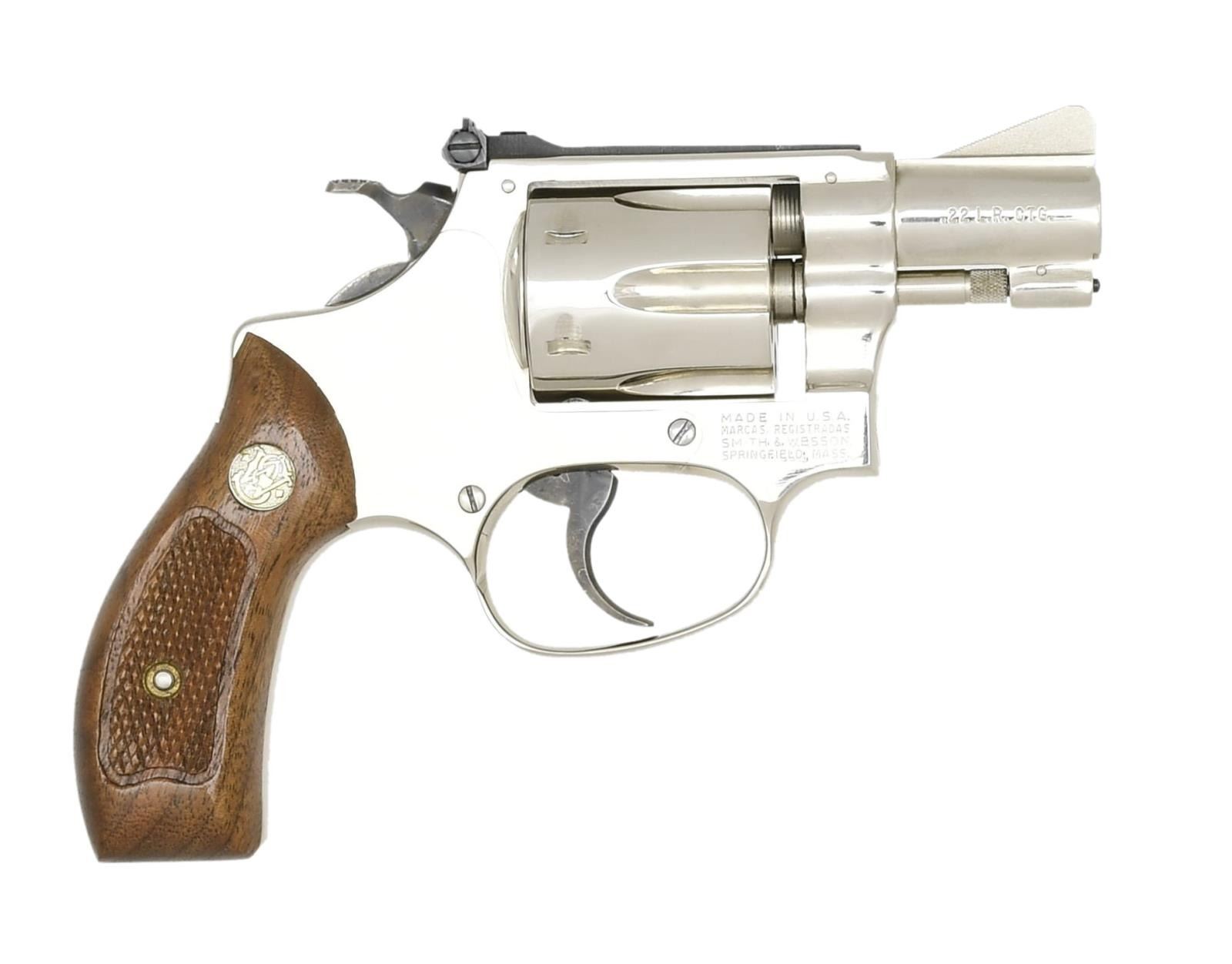 Cal. 22 LR. S# M115517. Bbl. 2" pinned w/ serrated ramped front sight & blued Micrometer rear. Mfg. 1978-1979 (1953-1991) w/ rnd. butt frame having matching numbered checkered walnut Magna grips; recessed cyl. having blued extractor. Case colored hammer & serrated faced trigger. UNATTACHED ACCESSORIES: matching numbered silver for nickel 2 piece box w/ all packaging to include complete tool kit. CONDITION: all aspects near excellent including bore & grips; appears new. (21-3599/NW). MODERN. $750-1,000.