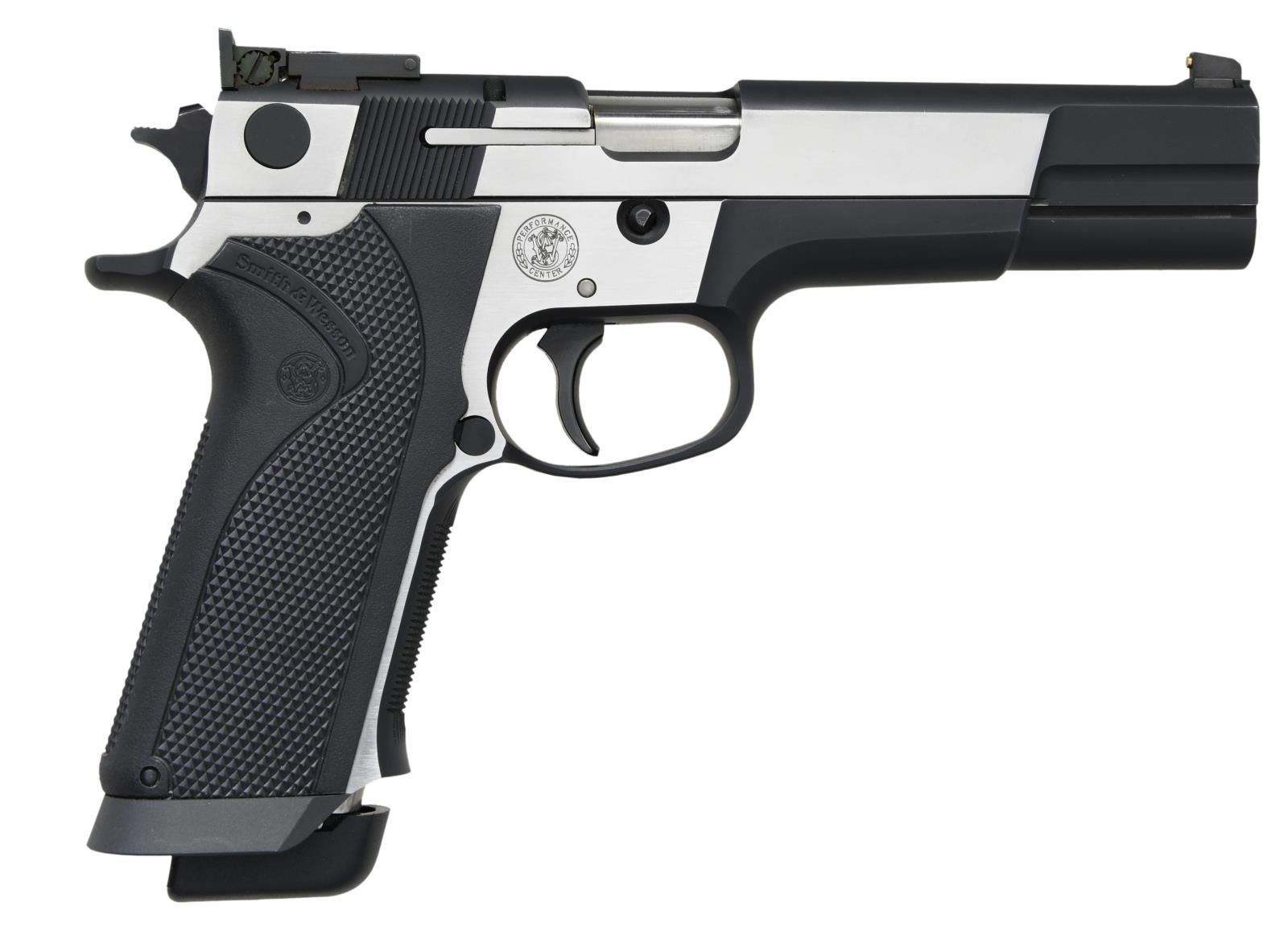 PISTOL. Cal. 40 S&W. S# DPC0027. Bbl. 5". Gold bead front sight. Adjustable rear sight. Performance Center single action competition style pistol. Pistol does not have a model number present but right side of frame has S&W Performance Center logo. Two tone finish w/ some areas having stainless finish & others a dark black. Enlarged mag release & mag well. Checkered black grips w/ S&W logo. MAGS: 2-11 rd. UNATTACHED ACCESSORIES: unnumbered blue factory hardcase w/ manual & accessories. CONDITION: grips show some light handling marks. Metal shows some dried grease near slide stop & light edge wear. Bright very good plus bore. PROVENANCE: Lifelong Collection of Terrance McCarty. (24-245/MJC). MODERN. $1,000-1,500.