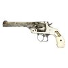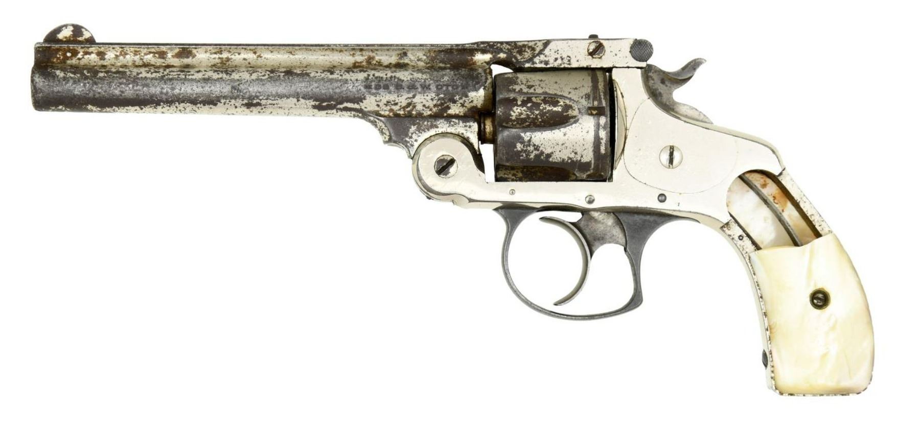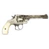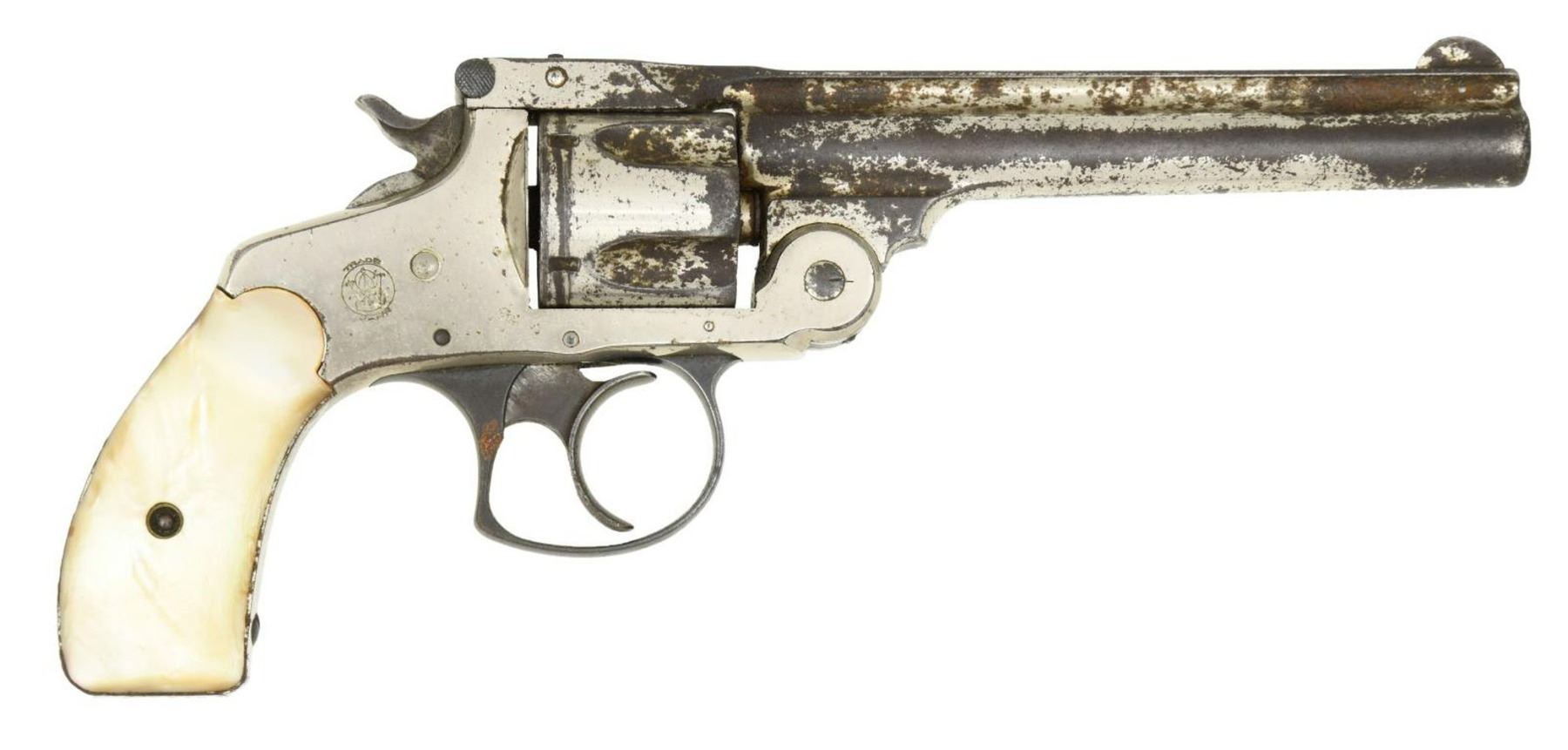 Cal. 38 S&W. S# 470610. Bbl. 5". Round blade front sight. Small U-notch rear sight. Nickel finish. Fourth model mfg. 1899-1909. Hammer not holding at full cock & cyl. spins freely, will require attention to fix. Pearl style grips. CONDITION: Left grip panel has top half missing, grips otherwise shows some chips, dings & handling wear. Metal retains 40% nickel w/ overall flaking, some dings & scattered oxidation. Dark bore w/ pitting that may clean up better. Provenance: From the Estate of Harry Henry. (23-5116/MJC). CURIO. $75-150.