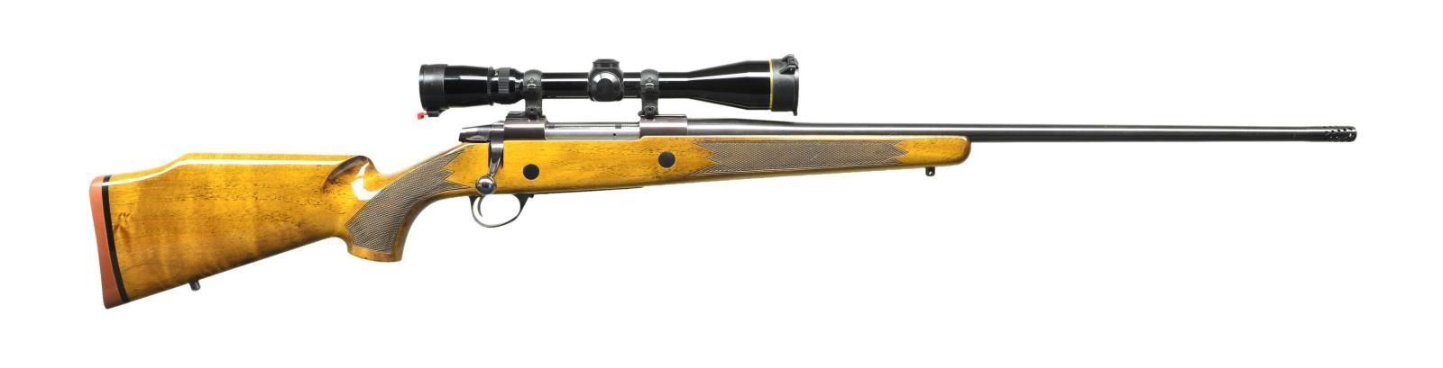 Cal. 375 H&H MAG. S# 618142. Bbl. 26" over 2" ported muzzle. Stoeger import mark on bottom of bbl. Leupold VARI-X III 3.5x10 scope w/ duplex reticle on tip off rings. L61R Magnum action w/ bolt numbered "142". Sporter style Monte Carlo stock w/ checkering at wrist & forearm, sling studs, rollover cheekpiece & Sako red pad. Inside channel of stock stamped "8810M" appearing to indicate Oct. 1988 mfg. CONDITION: near excellent overall blue & wood finish showing a few light marks in checkering & on metal. Receiver has acquired a plum tone due to age. Near excellent bore. (23-794/MD). MODERN. $1,500-2,000.