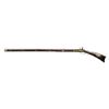 Cal. about 42. NSN. Bbl. 39 3/4" octagon measuring 13/16" across flats at muzzle. Top flat engraved “S Baum East Buffalo PA”. Brass blade front sight w/ fixed V notch rear sight. Unmarked trade lock. Plain trigger. Trim pin fastened full length curly maple cheekpiece stock. Incise carving is found around toeline, lock, sideplate & top tang. Left side has German silver plain non engraved rectangular lid pierced & segmented patchbox. Brass fittings include crescent buttplate, toeplate, finger curl trigger guard & sideplate. German silver ornamentation includes eagle, banner & eight point star in cheekpiece area w/ two half moons & shield around wrist. Forearm ornamentation includes fancy forearm plate bordered by tear drops w/ hearts forward of lock area, three sets of old man in the moon form the pin escutcheons w/ 2 sets of tear drops between them. Additional silver forearm fittings include faceted thimble, 2 faceted pipes & nose cap. Brass tipped hardwood ramrod. American Gunsmiths by Frank Sellers gives the name Samuel Baum in three different listings for Pennsylvanian makers of original Kentucky rifles. WEIGHT: 7 lbs. 2.6 oz. CONDITION: bbl. & lock have a dark brown appearance w/ surface corrosion on lock. Brass & German silver have an applied patina. Stock has a very good intentionally aged finish. Sound lock. Bore is bright w/ strong rifling. (01-21720/DS). ANTIQUE. $1,000-2,000.