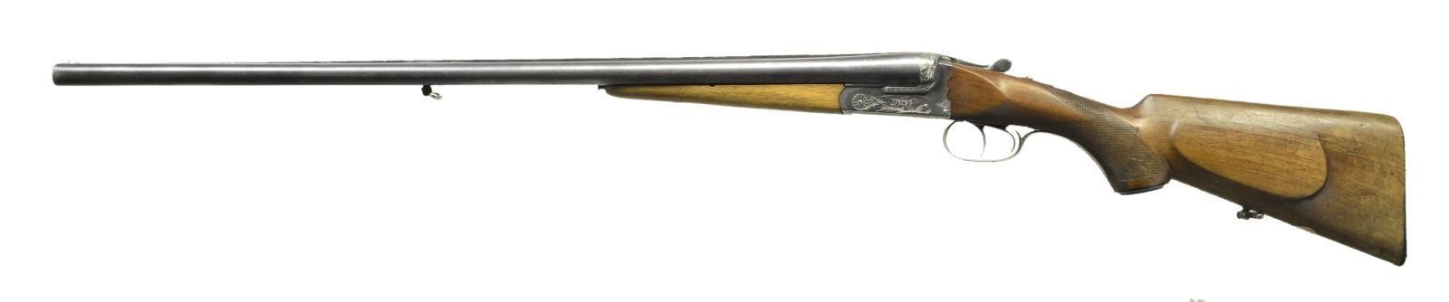 Cal. 16 Ga. S# 109441. Bbls. 27 5/8" w/ serrated solid rib & front bead. Chambers are 2 9/16" & choked “FULL” & “FULL”. Matching S#s, dbl. triggers & extractors. Frame & fences have floral & scroll engraving w/ sides showing a dog on point & belly a Mallard in flight. Checkered splinter forend, ebony capped semi pistol grip buttstock, sling swivels & raised cheek rest. LOP: 13 1/8” & 14 1/8” to buttplate. Importer marked. UNATTACHED ACCESSORIES: black plastic case.CONDITION: rib is broken & crudely repaired w/ 3 screws & now extends beyond the muzzle. Metal is a dull fading blue/gray patina & frame is polished bright to bare metal w/ trace of case color lurking in protected areas. Stock set is sanded w/ chips on the forend. Bores are bright w/ light pitting breech end & several scattered fine to light dents. PROVENANCE: "Save the Fine Guns". T&G German Gun Imports, bringing fine German guns to a more appreciative market. (22-5134/CW). MODERN. $300-400.