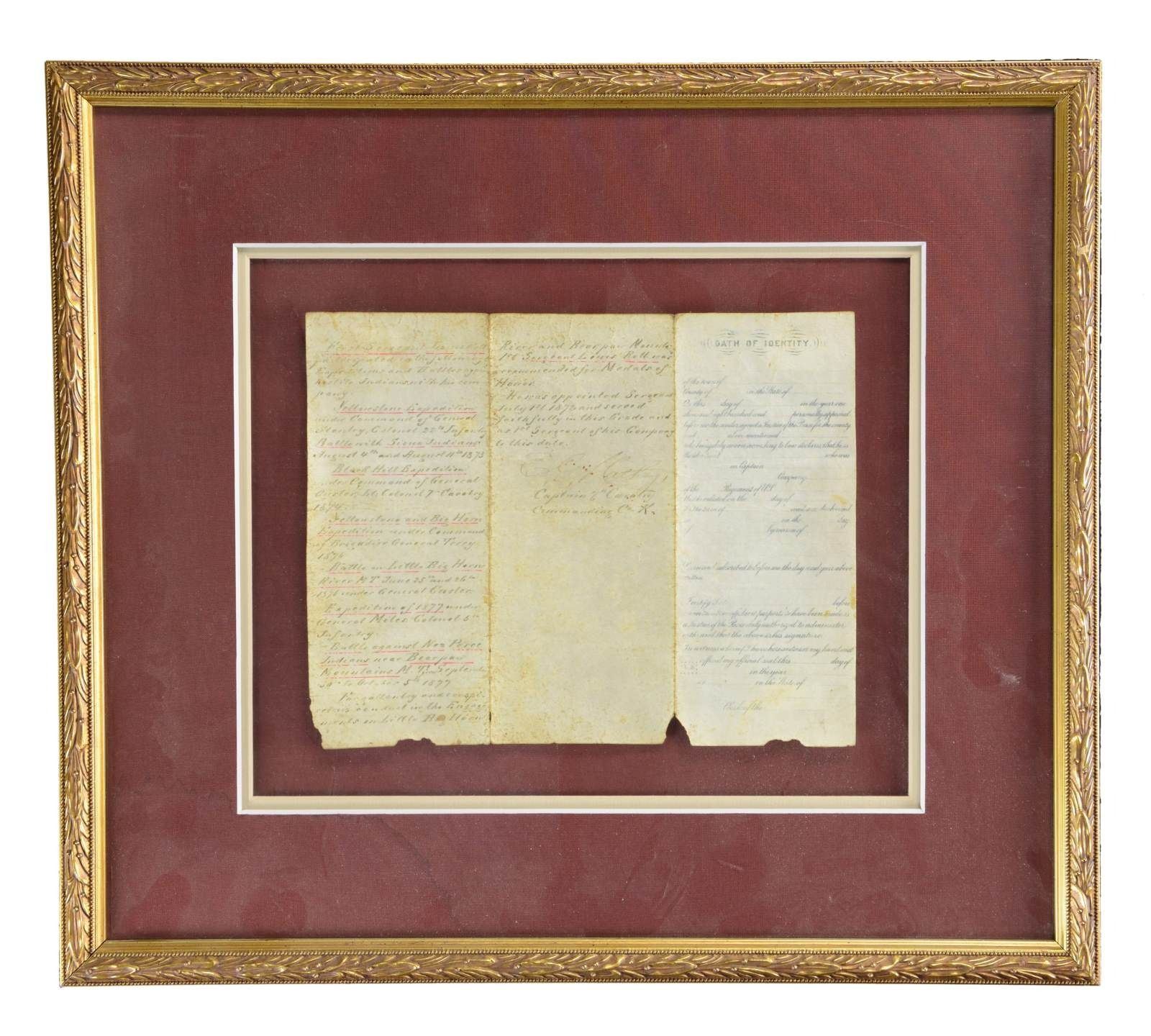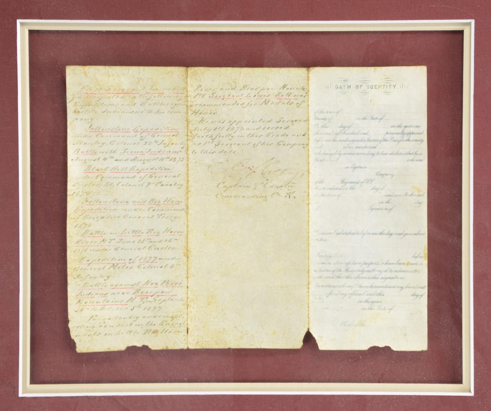 RECOMMENDATION FOR MEDAL OF HONOR. 9.5" x 7.5" vellum document in 16" x 18" archival frame. Louis Rott would fight with Custer and be among the lucky who survived the Battle of Little Big Horn and is recommended in this document by his commander Captain E. G. Mathey Co. K, 7th US Cavalry for Congressional Medal of Honor. Mathey lists all of Rott's battles and campaigns and closes: "For gallantry and conspicuous conduct in the engagements on the Little Big Horn River and Bearpaw Mountain 1st Sergeant Louis Rott was recommended for Medals of Honor. He was appointed Sergeant July 1, 1872 and served faithfully in this Grade and as 1st Sergeant of his Company to this date. E. G. Mathey Captain 7th Cavalry Commanding Co. K". UNATTACHED ACCESSORIES: copy of a letter from Gloria Wood who states she is the last living descendant Sergeant Louis Rott and had the pipe mounted in 1985 designed by artist at Southern Illinois University. CONDITION: archival framing not removed, but appears good, soiling and staining, text is light but discernible, chipping at bottom of folded vellum. PROVENANCE: Louis Rott, 7th US Cavalry, descent of family to last surviving member; Gloria B. Wood; Heritage Auctions 2011; Martin Lane Western Americana Lifetime Collection. (02-22009/JS). $1,000-2,000.