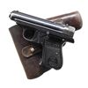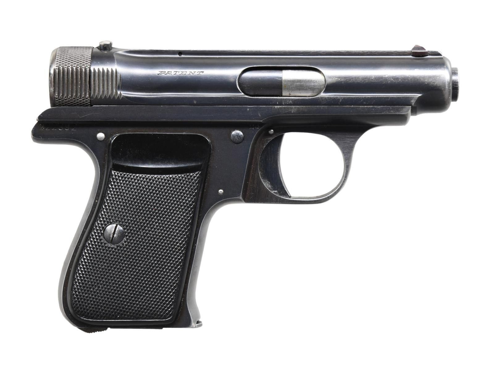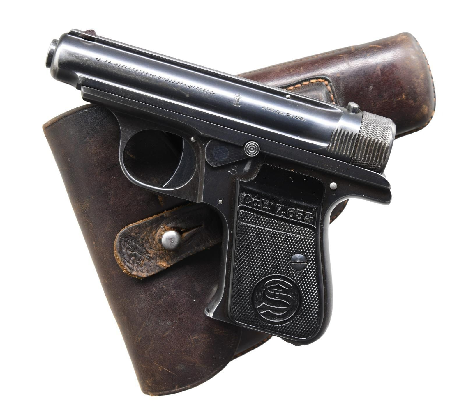 Cal. 7.65mm (32 ACP). S# 222392. Bbl. 3". Blade front sight. Square notch rear sight. Pistol falls in the serial range of Behördenmodell Sauer pistols but it lacks the trigger safety. Blued finish. Checkered black grips w/ intertwined logo on left panel. MAGS: 1-7 rd. UNATTACHED ACCESSORIES: brown leather holster marked "SAUER" on inside. CONDITION: grips show some di ngs & handling marks. Metal retains 80% original blue w/ some edge wear, freckling on straps & scattered fading. Very good bore. PROVENANCE: from the Lifelong Collection of Robert "Mike" Bricker. (24-1110/MJC). CURIO. $300-500.