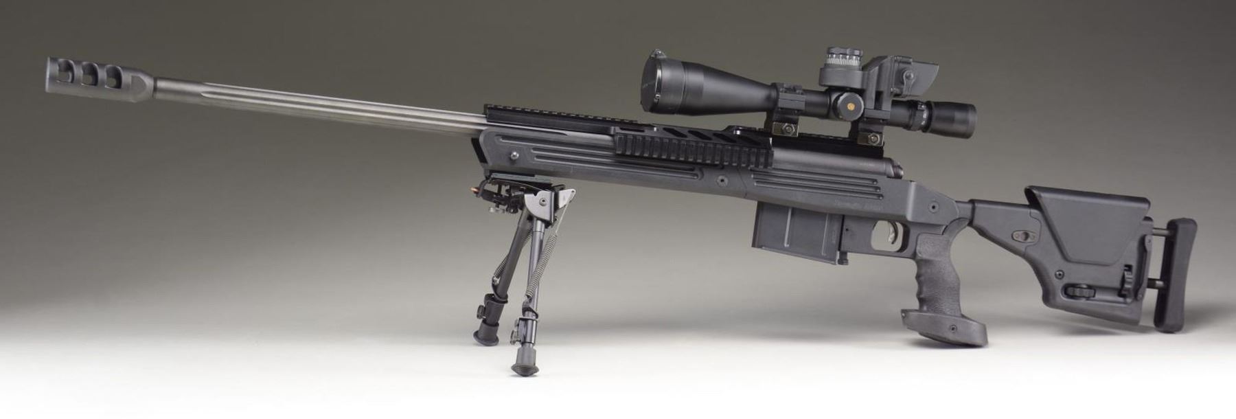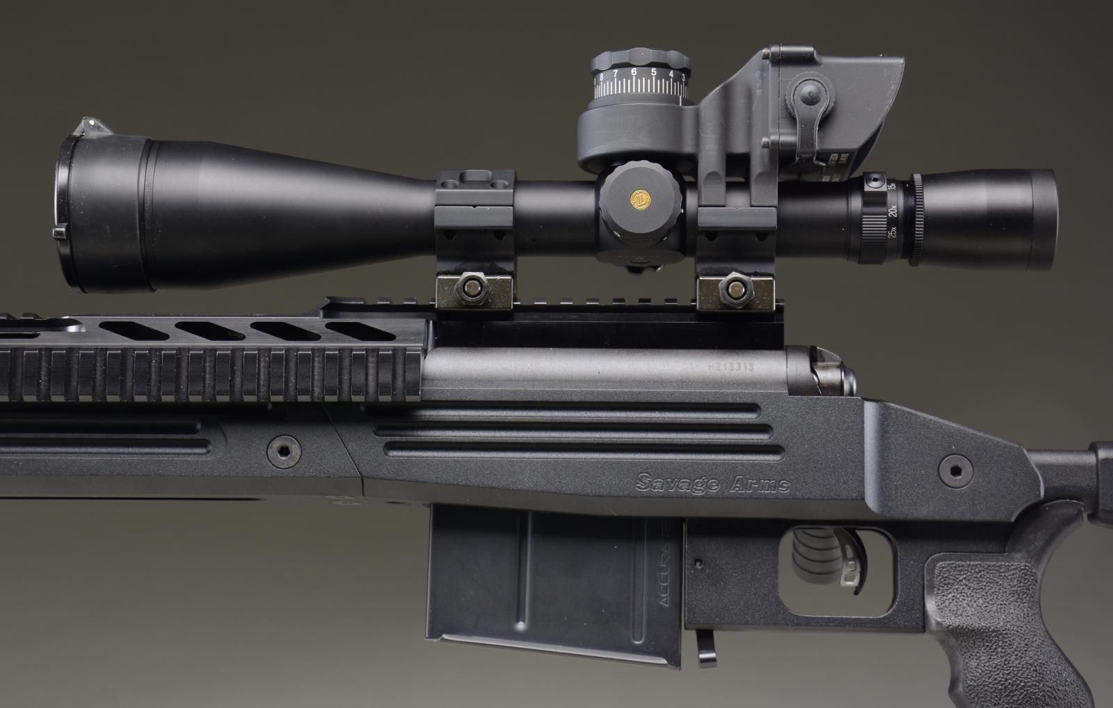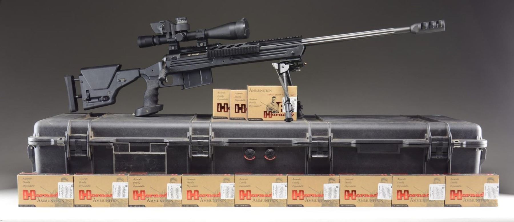 BOLT ACTION RIFLE. Cal. 338 Lapua. S# H213313. Bbl. 26" fluted heavyweight plus large muzzle break. Action features include AccuTrigger, large bolt handle & top tang sliding safety. Savage aluminum chassis AccuStock w/ pistol grip having adj. stop & PRS2 butt having adj. comb & LOP. Leopold Mark 4, 8.5-25x50mm LR/T matte finished 30mm scope w/ target turrets, AO & mil-dot reticle. Scope is fitted w/ a Barrett Optical Ranging System (BORS). The BORS features a constantly adapting ballistic computer accounting for every factor & makes instant sighting calculations. Barrett claims the BORS is "like having an army of ballisticians behind every shot". Optics are mounted w/ Barrett rings on the +20 MOA scope rail w/ Picatinny accessory rails ahead of the action & on the sides of the chassis. Also includes a Harris bipod. MAGS: 1 detachable box mag. UNATTACHED ACCESSORIES: plastic ammo box containing Hornady 338 Lapua, 285gr BTHP match ammo marked "Cosmetic/Blemish". 11 boxes are full, 1 box contains 7 loaded rounds & 13 brass cases. Rifle is housed in a Pelican 1770 hardcase w/ fitted foam interior. Also included is: instruction manual, test target, warranty registration card, hang-tag, safety, AccuTrigger, Savage knives, & Harris bipod & NRA brochures. Accessories included are an M4 stock wrench, rubber butt extension, allen wrench, foam ear plugs & trigger lock. CONDITION: near new & excellent in all respects. Consignor relates only 13 rds were ever fired. Optics are clear and bright. (24-1242/DS). MODERN. $3,000-4,000.