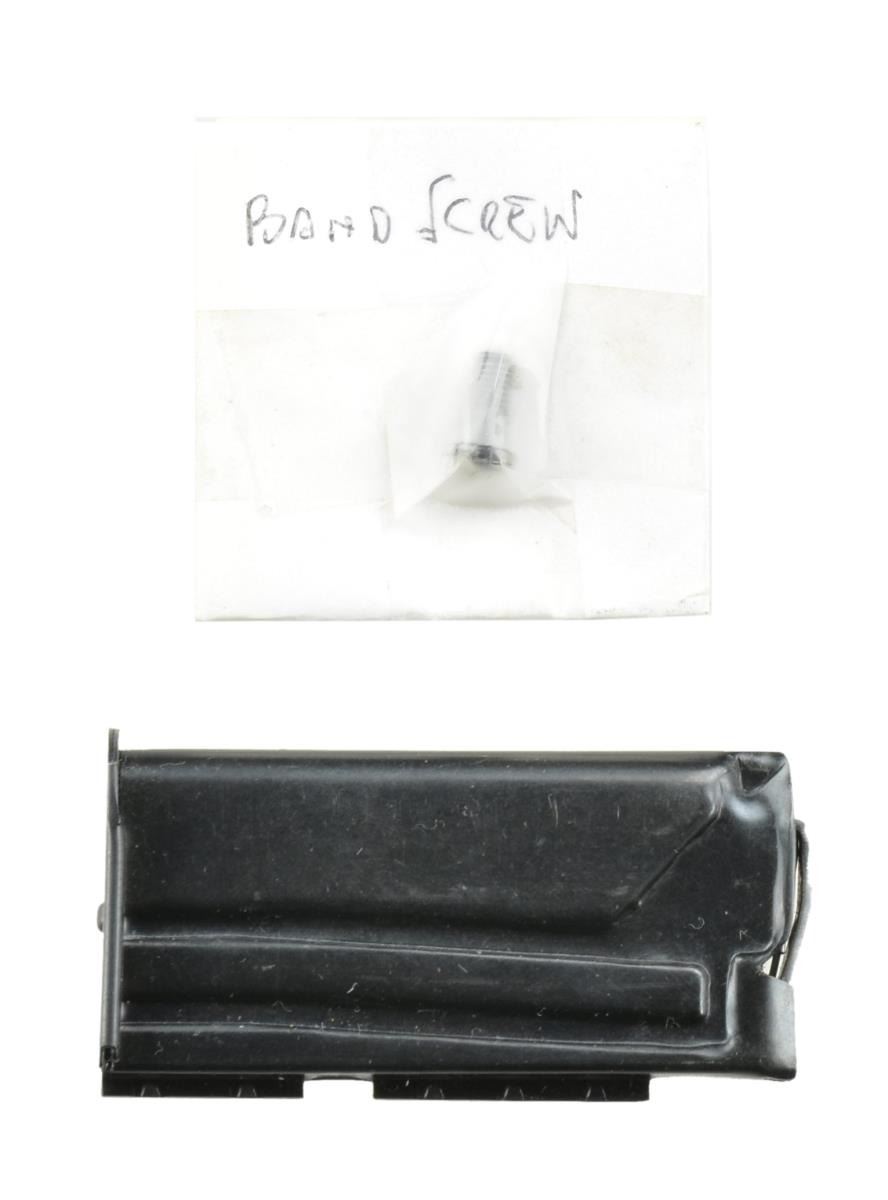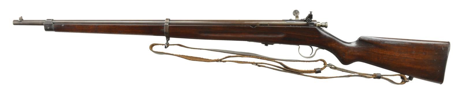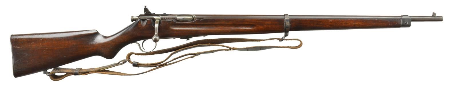 Cal. 22 LR. S# 40832. Bbl. 25" integral w/ receiver. Blade front sight & Savage receiver peep sight. Bolt action w/ manual cocking piece & strap type safety. Band fastened full length finger groove rnd. knob military style stock w/ grooved steel buttplate. Military leather sling on original swivels. Mfg. 1919-1932. MAGS: 2 total. 1 Original 5 rd. & 1 - 7 rd. replacement. UNATTACHED ACCESSORIES: replacement band screw. CONDITION: 60% dull fading blue. Wood has age darkened appearance w/ added finish over wear w/ scratches, dents & handling marks. Bright bore retains strong rifling. PROVENANCE: from the estate collections of Charles P. Obremski. CURIO. (22-1299/DS). $300-400.