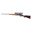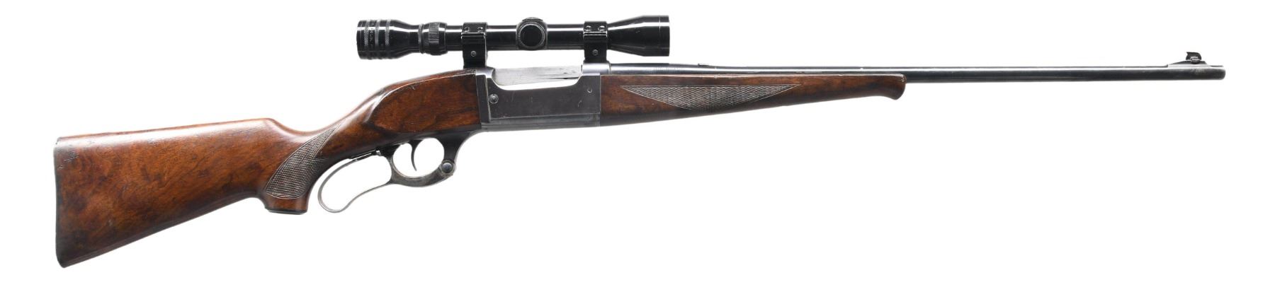Cal. 300 Savage. S# 538044. Bbl. 24" round. Ramp mounted bead front sight w/ filler in rear dovetail. Action is drilled & tapped for aftermarket Weaver style scope mounts. Redfield 2-7x scope w/ standard crosshairs. The action features a brass rotary mag., cocking indicator & bent tab safety. Blue finish w/ case colored lever. Schnable tipped forearm & hard rubber capped pistol grip stock of checkered walnut w/ grooved steel buttplate. Mfg. 1950. CONDITION: 75% lightly faded original blue showing edge & carry wear. Lever has lightly faded case colors. Original wood finish shows light wear w/ numerous scratches, marks & small dents. Very good bright bore. Scope has clear optics, 1 adjustment cap is missing. (24-2071/DS). CURIO. $500-700.