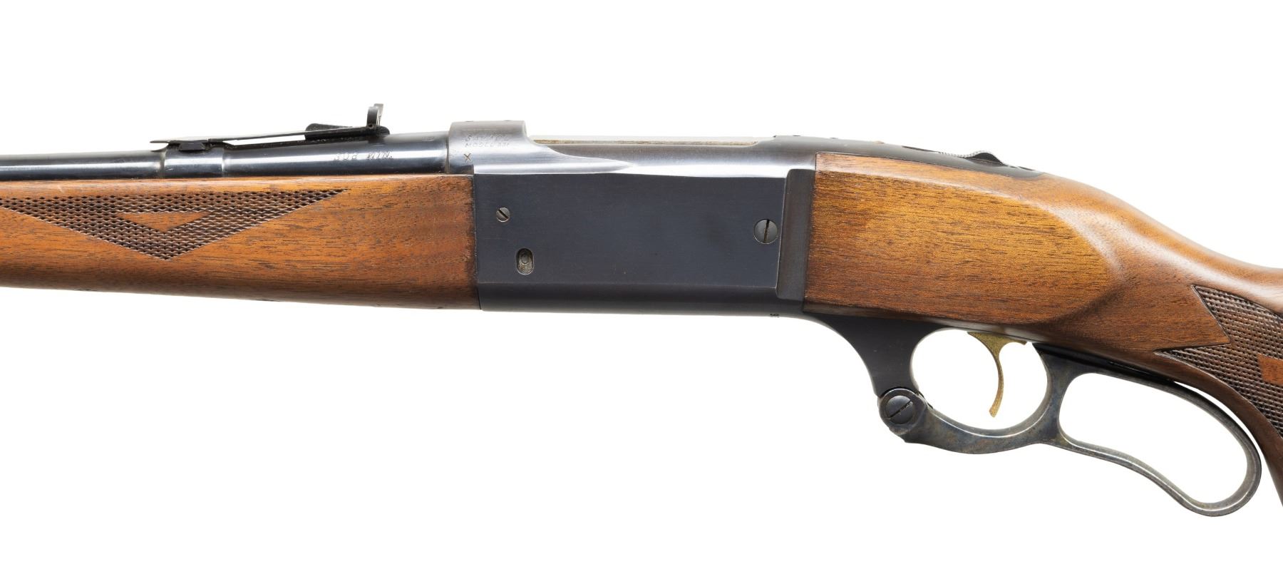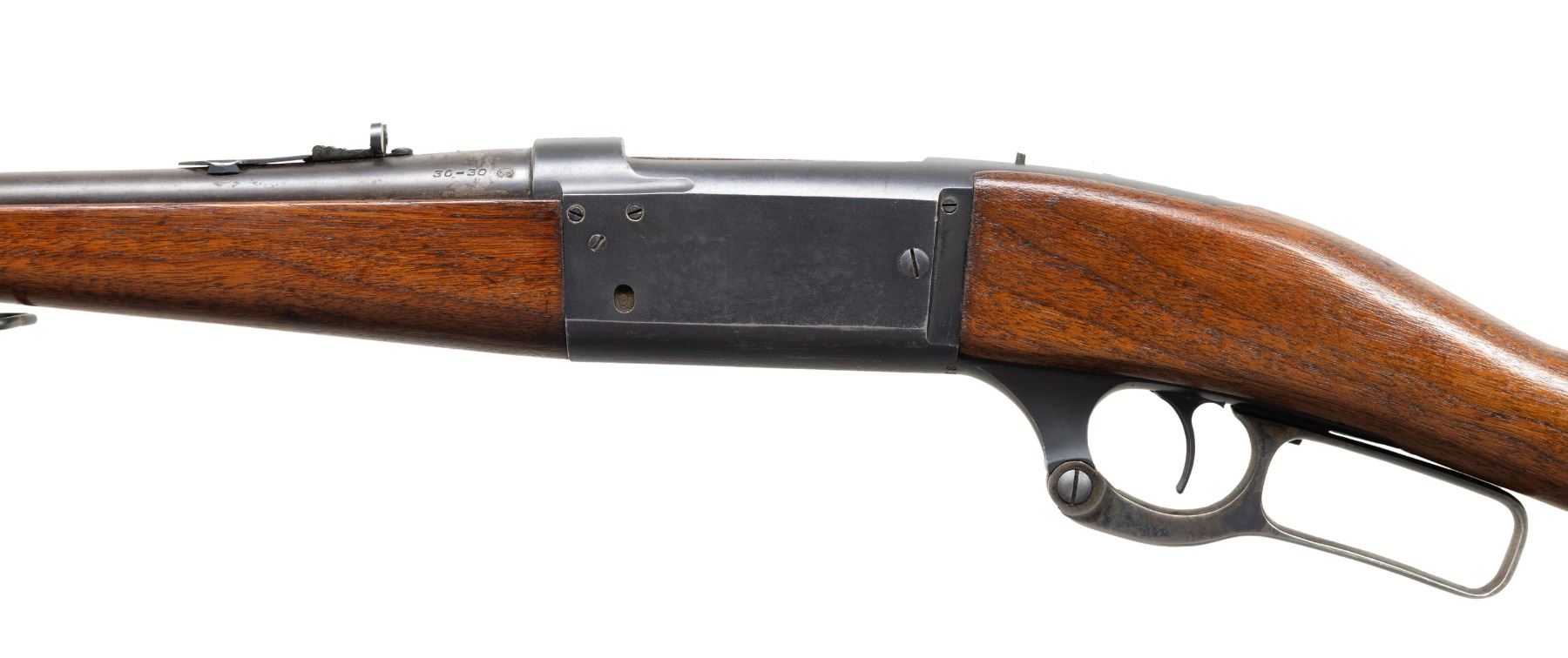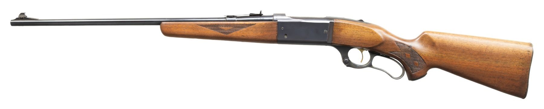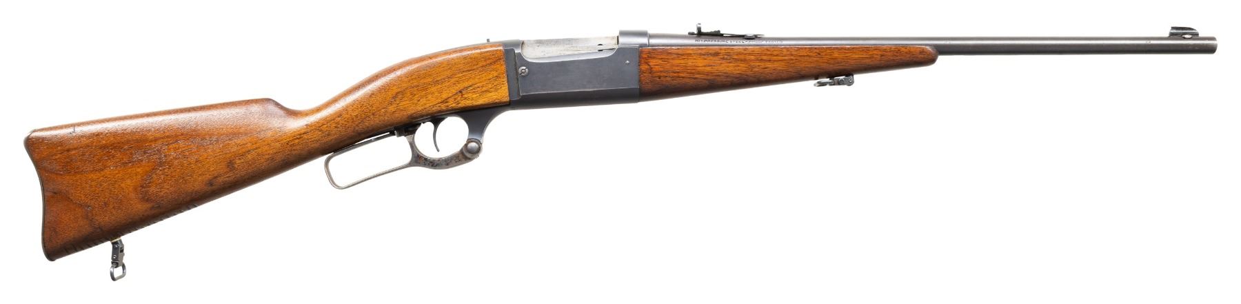 1) 99H. Cal. 30-30. S# 321368 (mfg. 1929). Bbl. 20". Marbles Sheard blade front sight & Marbles adj. elevator rear sight. Rotary mag. action D&T for tang sight, brass cartridge counter, sliding lever safety & cocking indicator. Walnut stock set w/ added sling studs w/ QD swivels, carbine buttplate & 20 kill notches. CONDITION: fair blue fading brown patina showing streaks of carry wear, scattered marks & peppery oxidation. Wood has added finish w/ a few hairline cracks. Wood has extra varnish with scattered handling marks. (25-5968/MD).