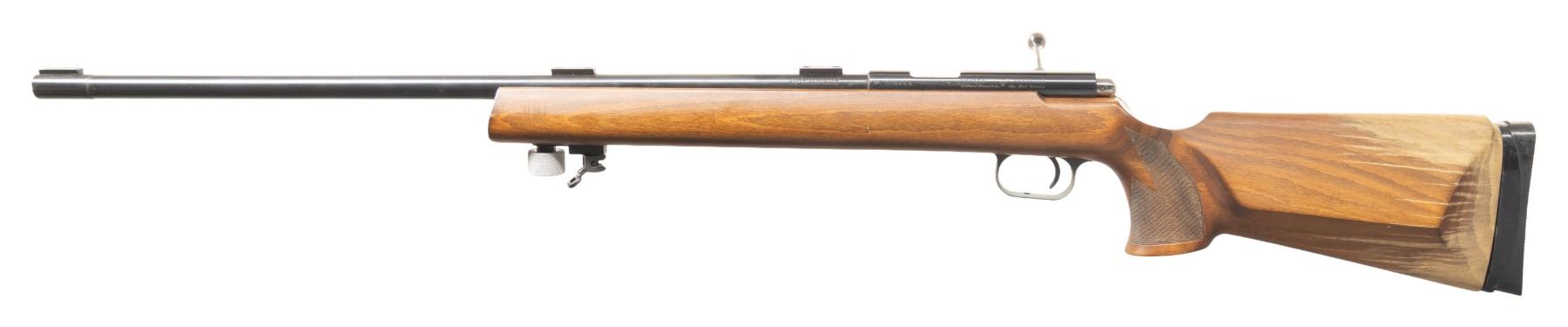 Cal. 22 LR. S# 1105026A. Free-floating 26" bbl. w/ 3 sight blocks; Ulm, West German 1976 Nitro proofs. Grooved single shot receiver. Hardwood stock w/ checkering at grip, 13" forearm accessory rail having sling point, with replacement adj. buttplate. CONDITION: very good blue. Buttstock balance has very good finish with heavy sanding around buttplate. Very good rifling. (25-6634/MD). MODERN. $300-400.